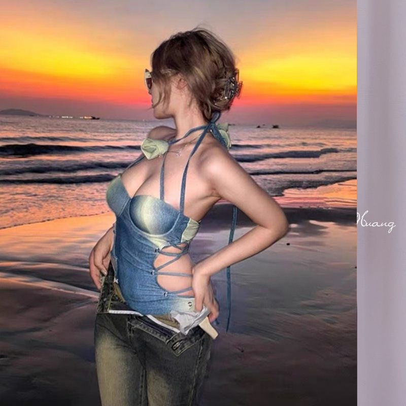 新款温泉泳衣女连体平角保守显瘦遮肚性感牛仔复古高级感泳装