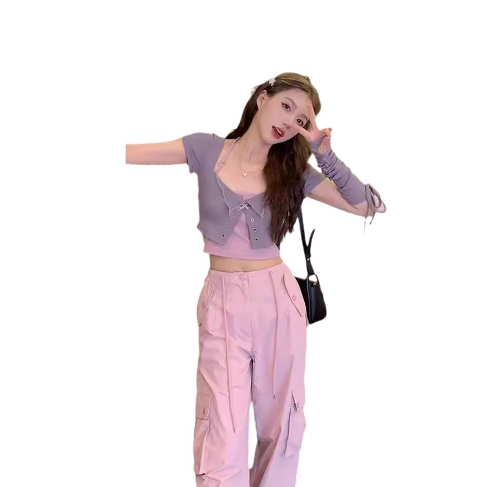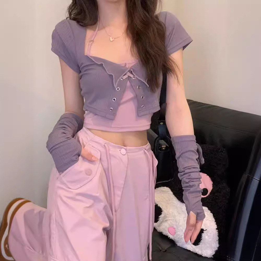 纯欲甜酷吊带短袖开衫两件套夏季多巴胺穿搭辣妹高腰短款上衣套装