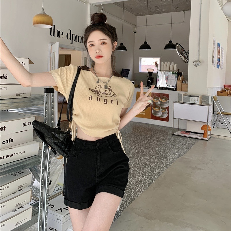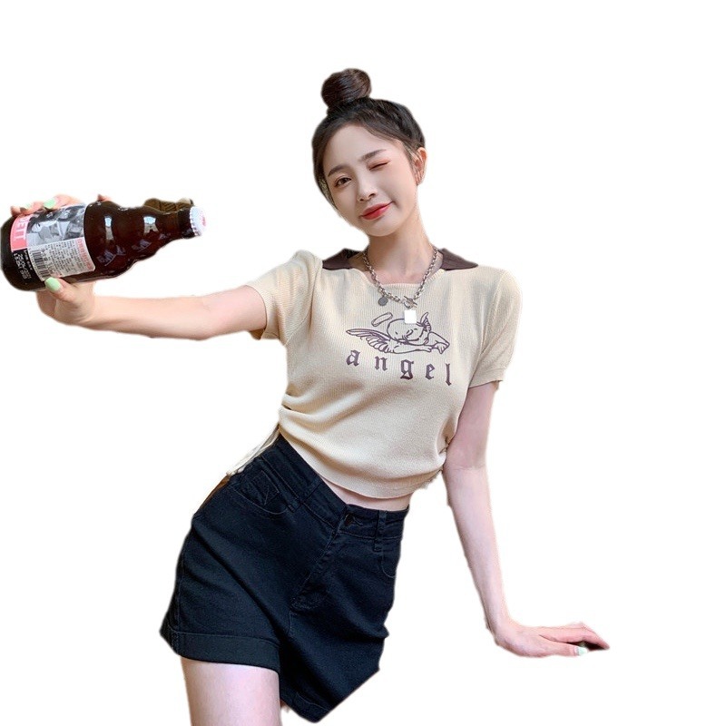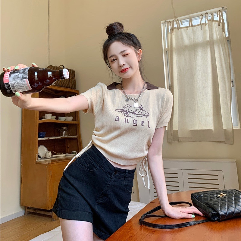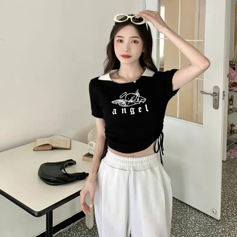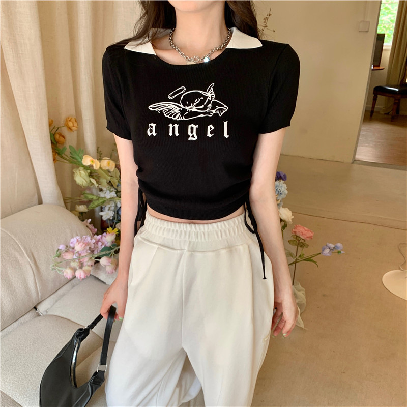 美式复古系带polo领上衣2025设计感纯色短款收腰修身短袖T恤女