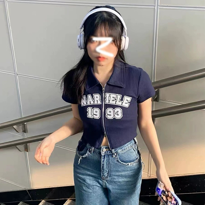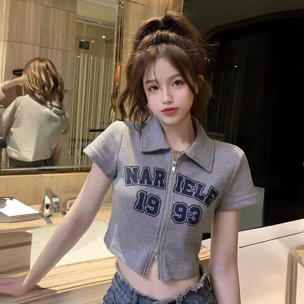 大码美式复古辣妹高腰短袖上衣女夏新款拉链开衫短款显瘦polo上