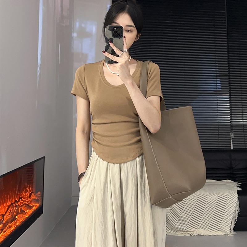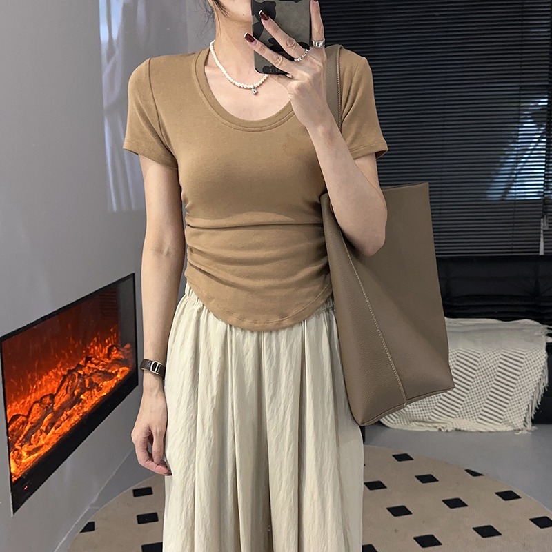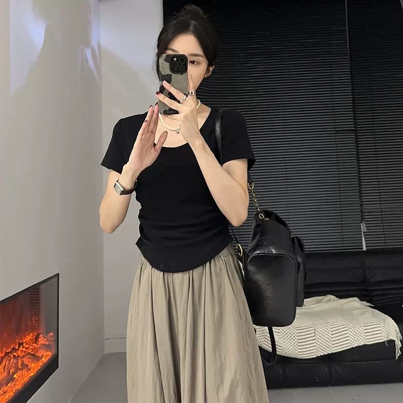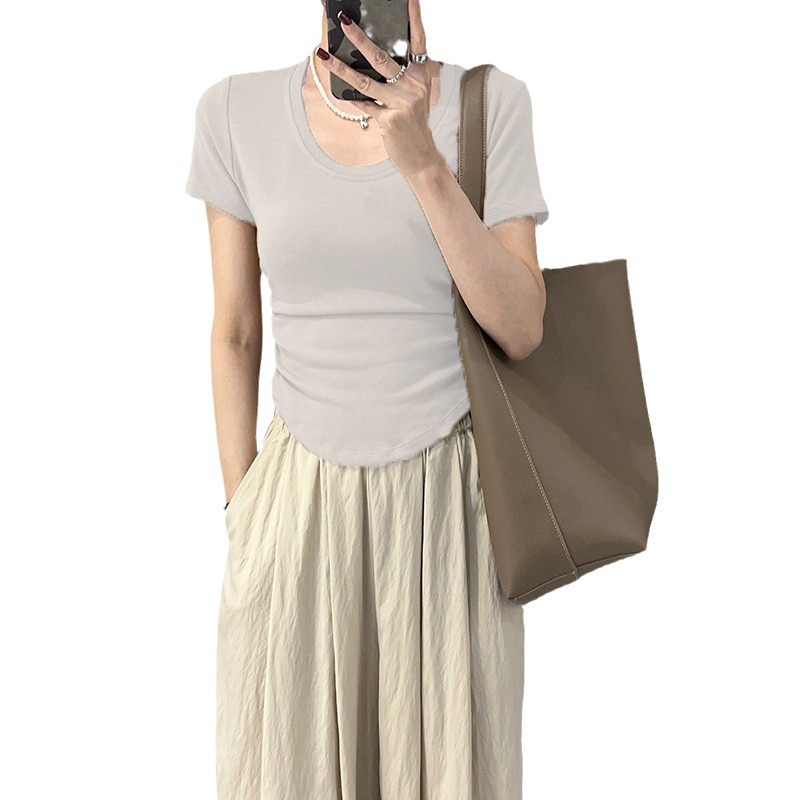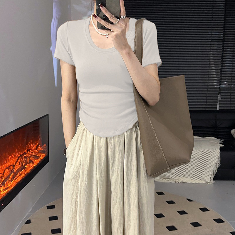 百搭正肩短袖T恤女春夏季U领修身显瘦打底衫短款小众不规则小上衣