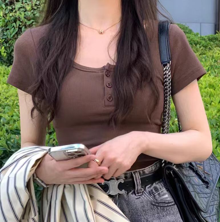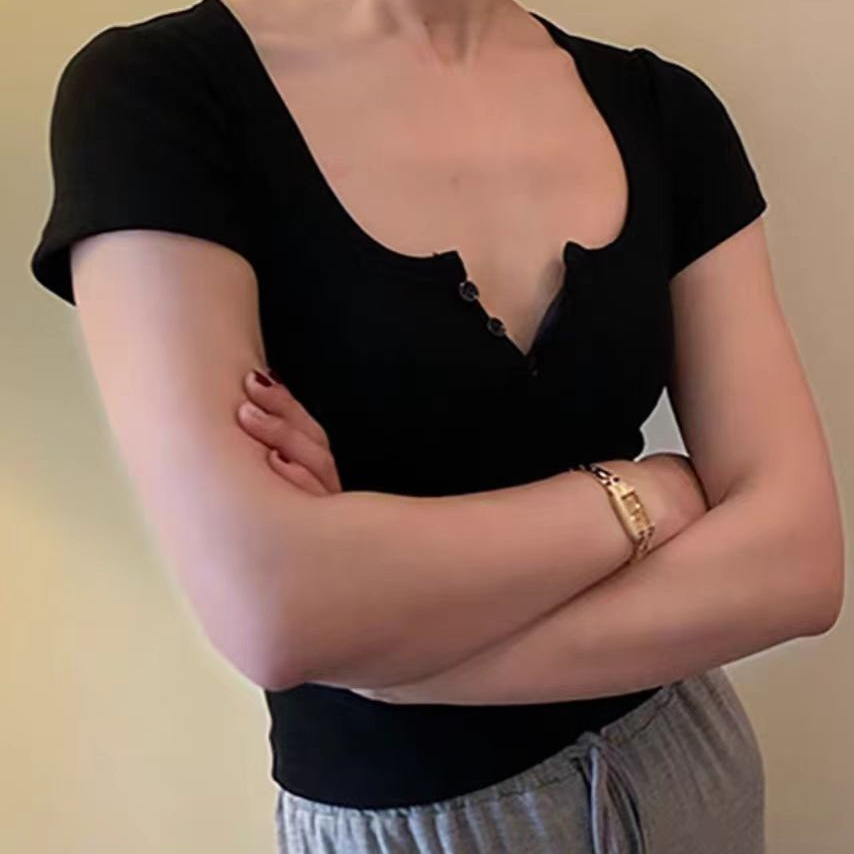 纯欲性感辣妹短袖T恤女露锁骨设计感夏季新款高腰短款纯棉ins上衣
