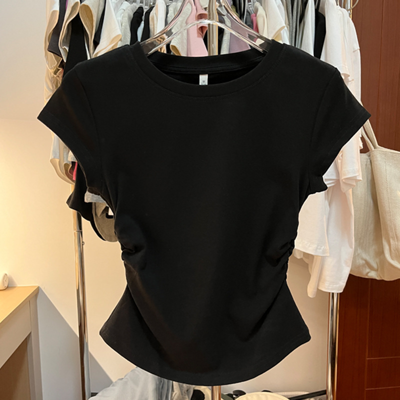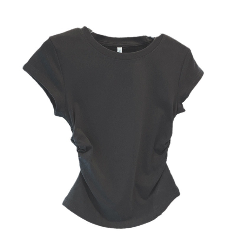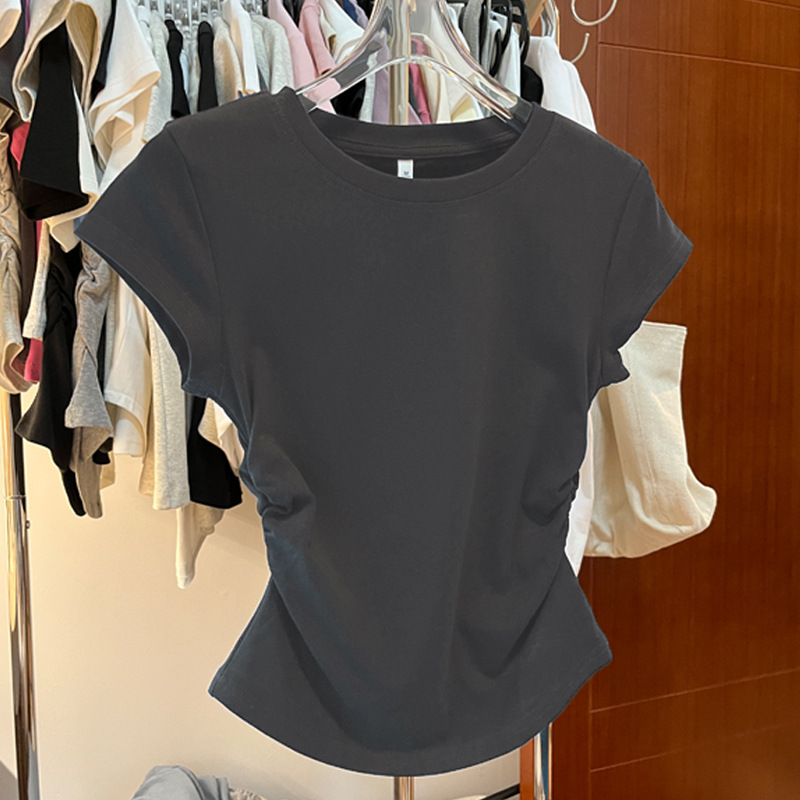 欧美纯色正肩T恤短袖女夏修身显瘦别致短款卡腰百搭收腰灰色上衣