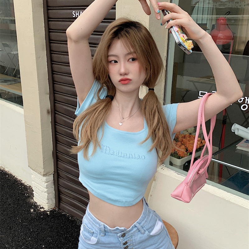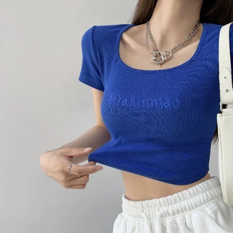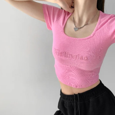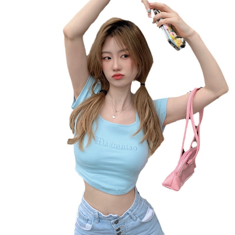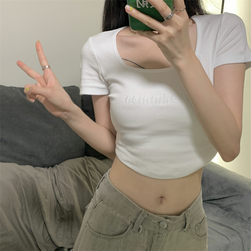 欧货设计感美式短袖t恤女辣妹方领短款修身小众纯色别致显瘦上衣