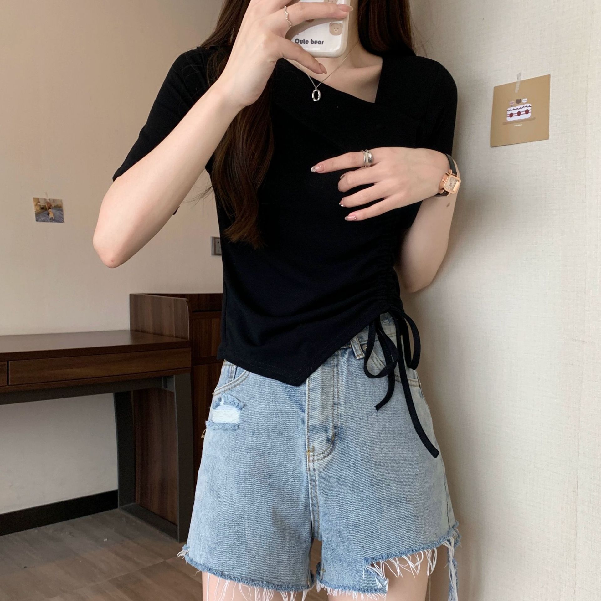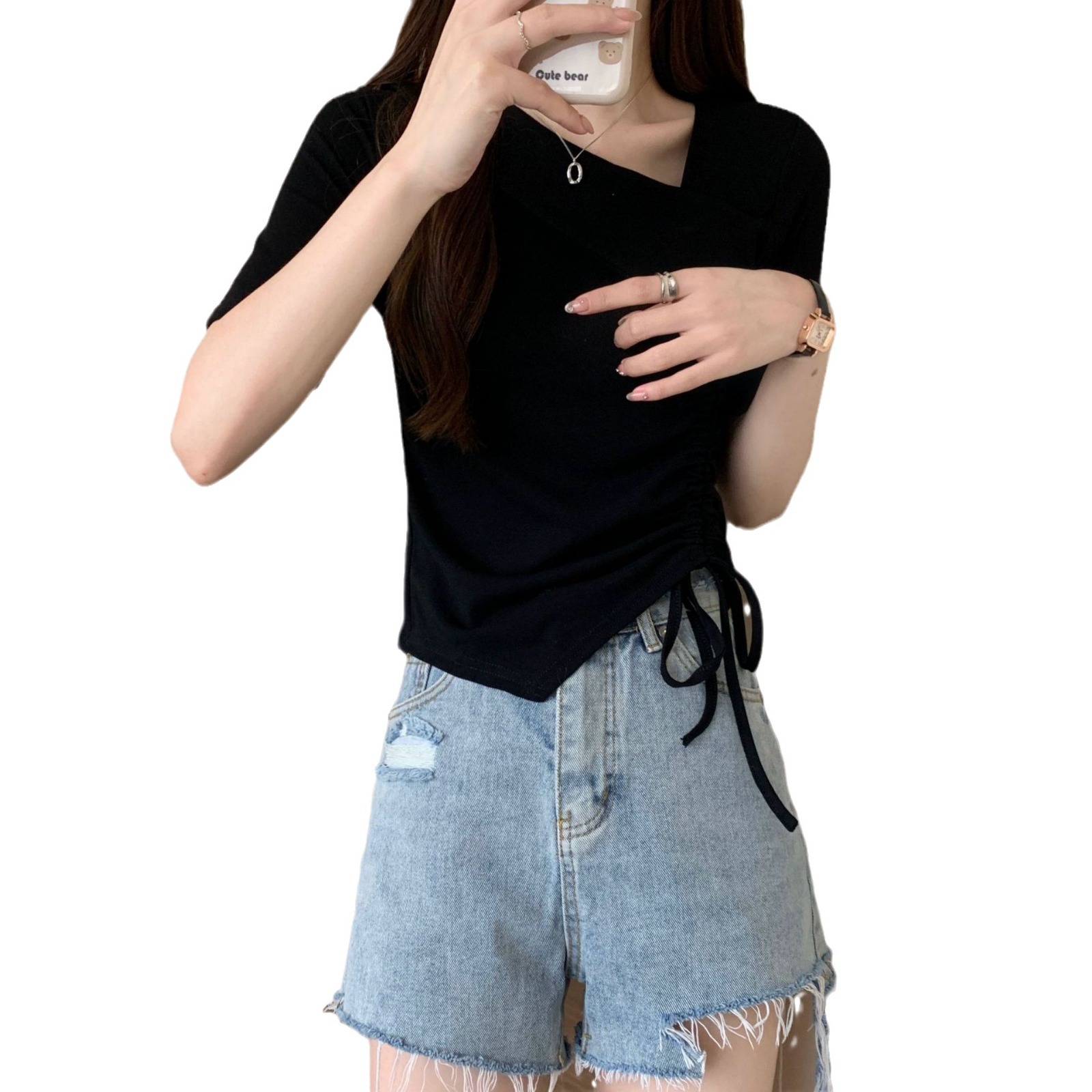 夏新款纯欲风短款辣妹女装纯色抽绳连帽拉链白色短袖t恤上衣