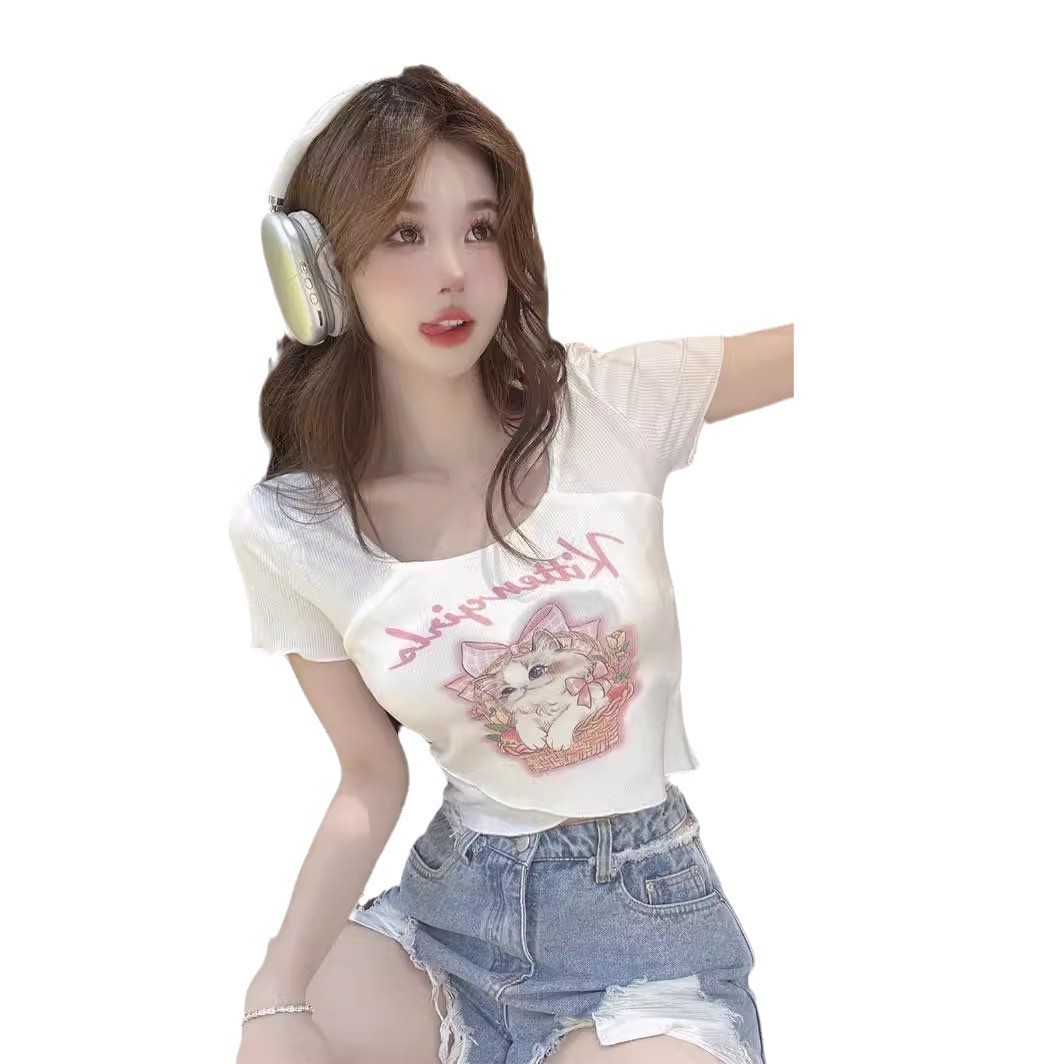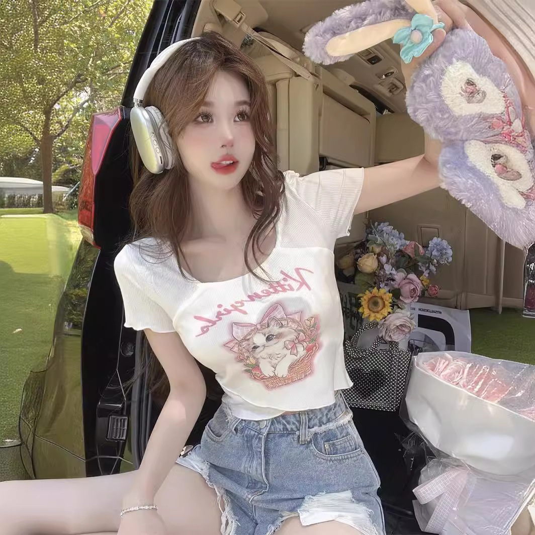 纯欲甜辣妹港味复古chic性感方领短款上衣设计感小众短袖t恤女夏