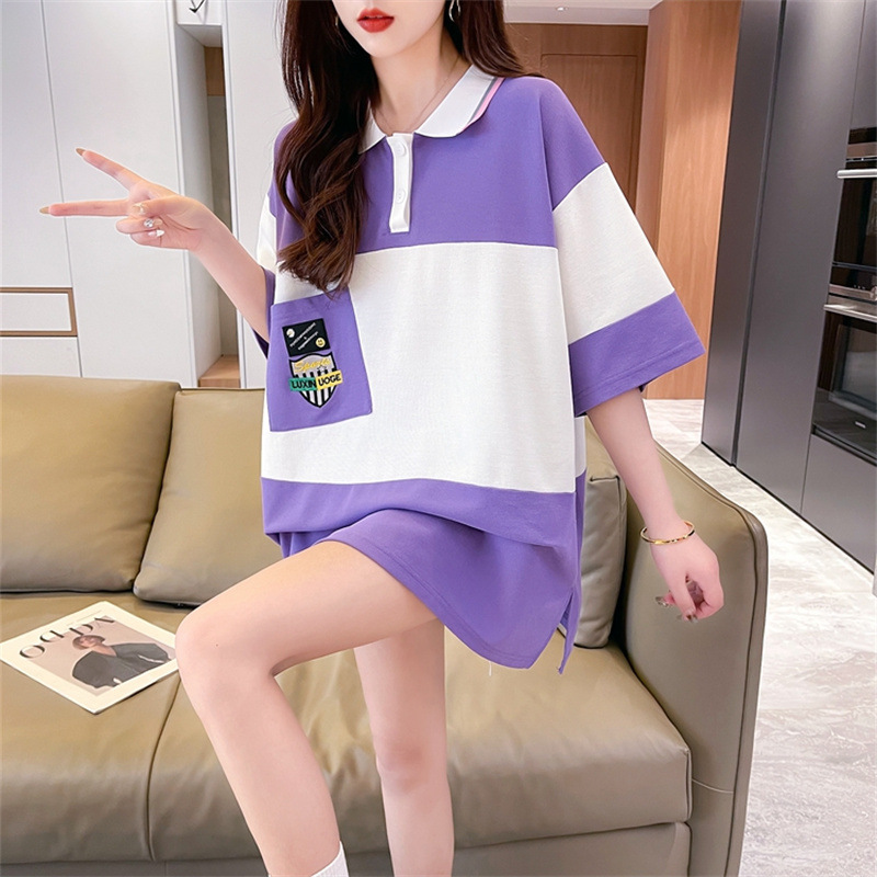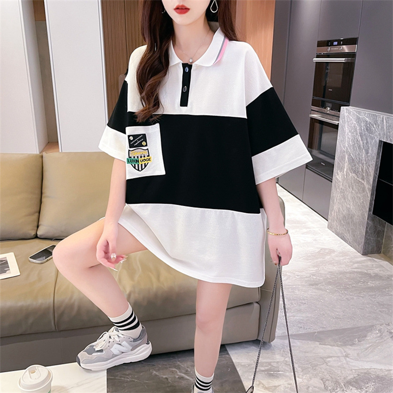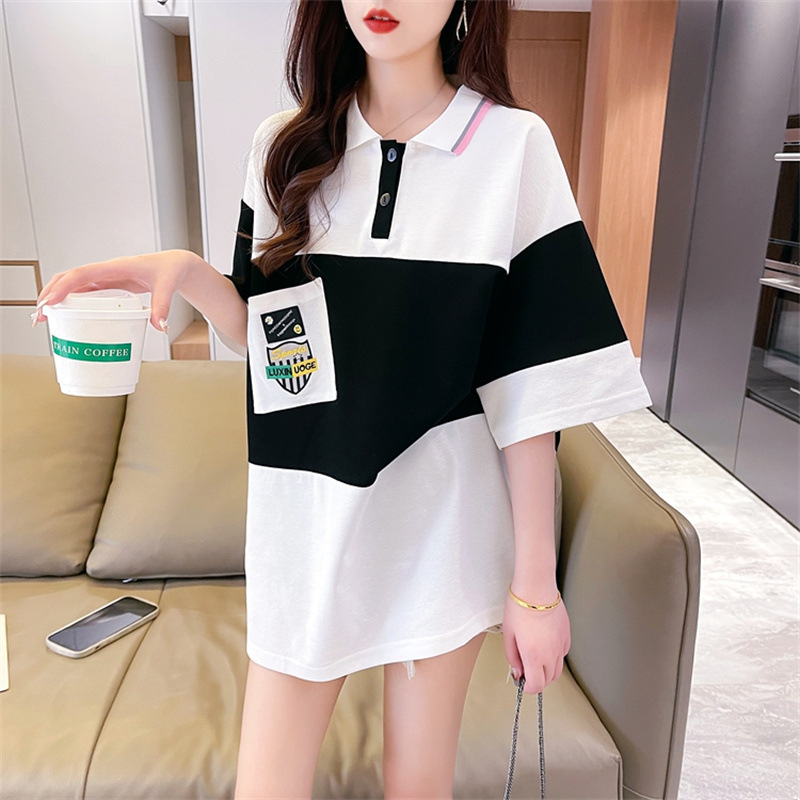 夏季大码夏装拼接撞色翻领短袖t恤女中长款宽松休闲学院风polo衫
