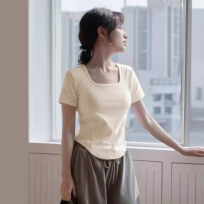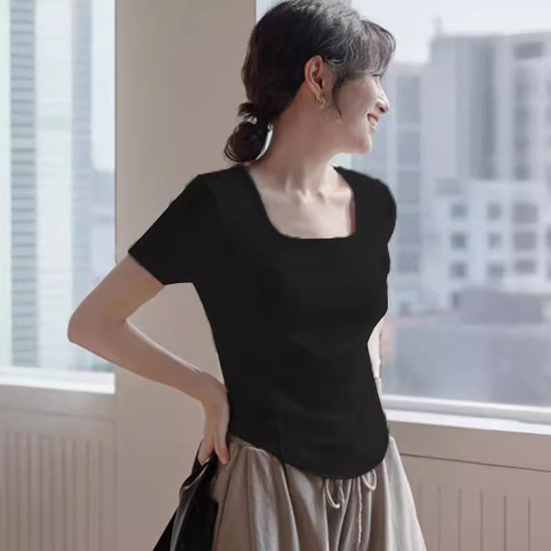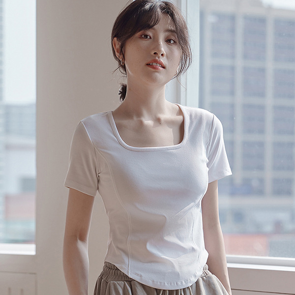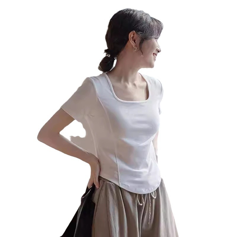 白色方领正肩短袖t恤女夏季别致辣妹高腰口修身显瘦短款鱼骨上衣