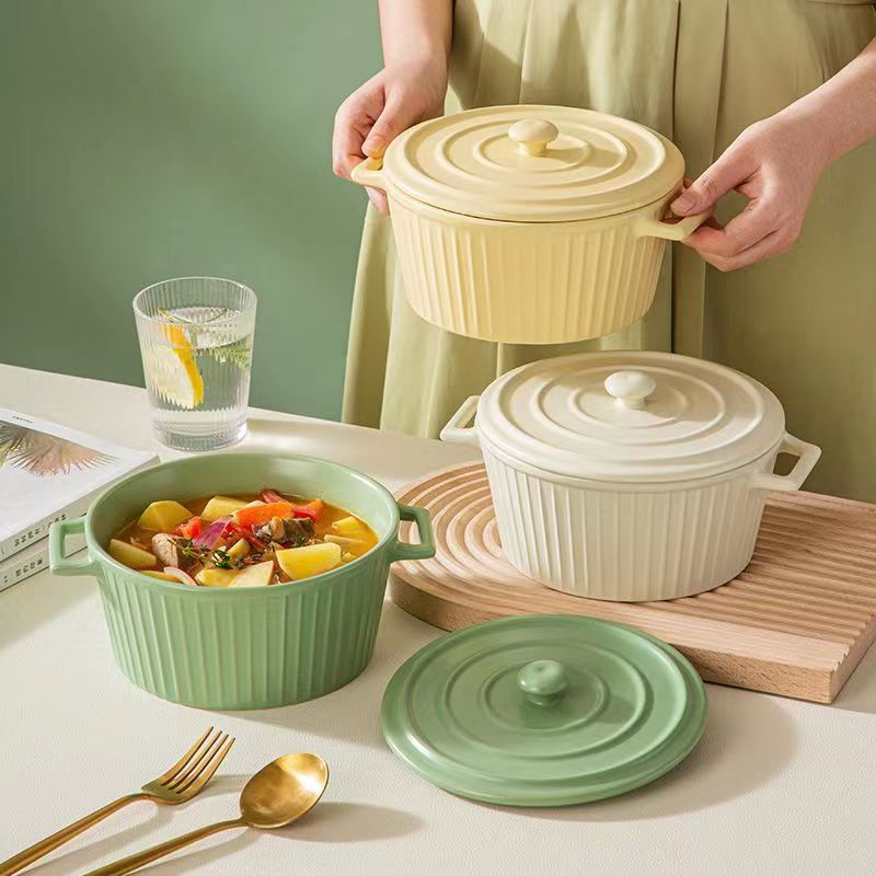 大号陶瓷汤碗家用高级感泡面碗带盖奶油风装汤盆竖纹面碗烤箱