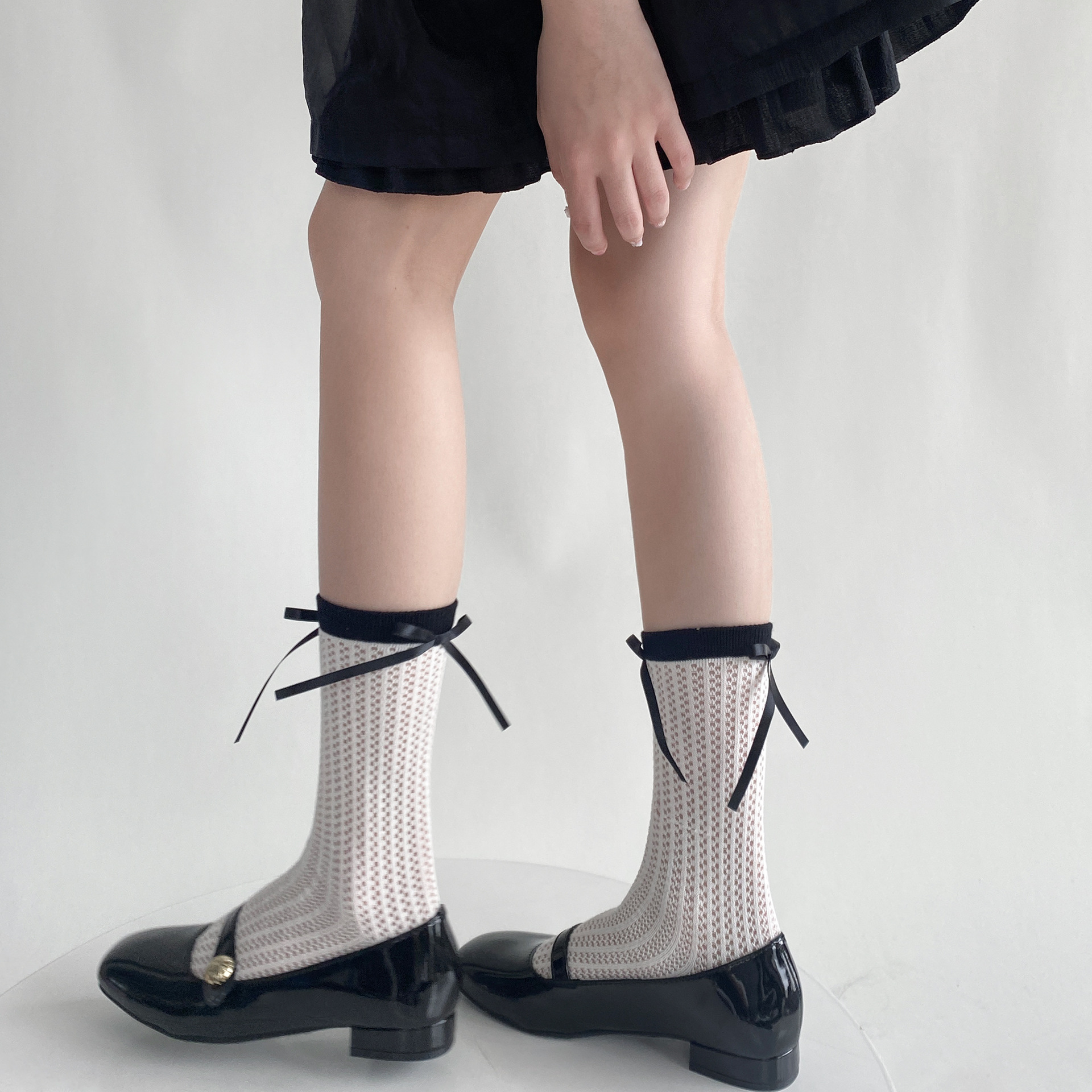 春夏薄款撞色镂空网眼中筒袜女透气吸汗百搭款黑白复古英伦风夏季