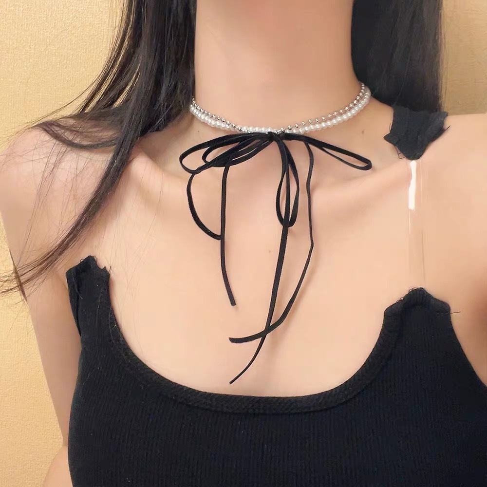 韩国简约甜美双层珍珠蝴蝶结流苏项链饰品女百搭高级感串珠锁骨链