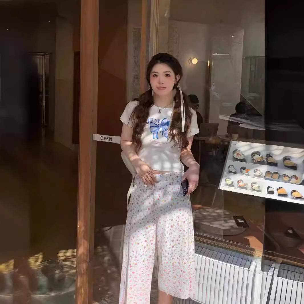 蝴蝶结小众甜美夏季印花紧身短袖T恤小个子修身新款短款上衣