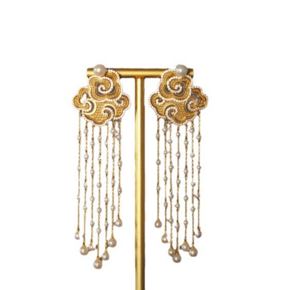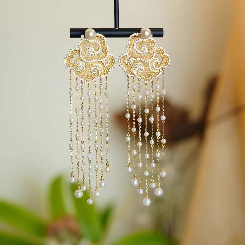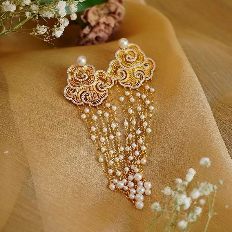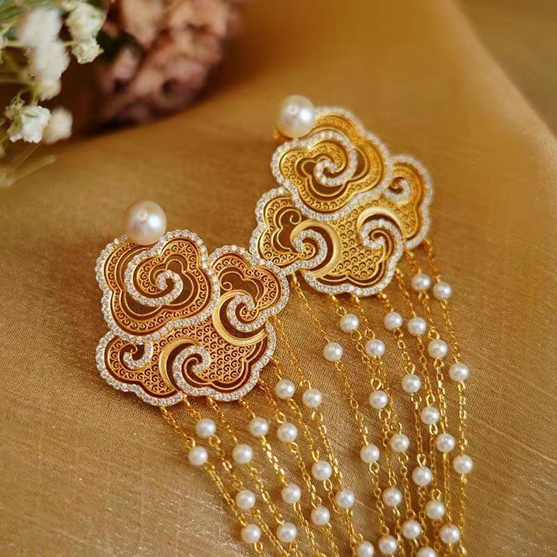 祥云流苏珍珠耳钉新中式轻奢气质耳坠国潮复古精致耳饰高级感耳环