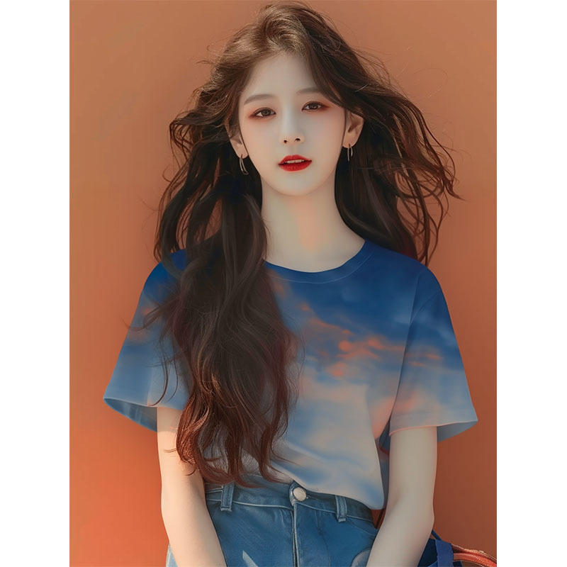 蓝色晕染短袖t恤女新款爆款夏季小个子慵懒风设计感宽松上衣