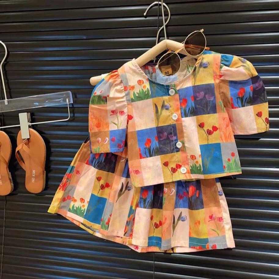 新品女童彩格花朵泡泡短袖短款上衣短裙两件套2025夏装套装