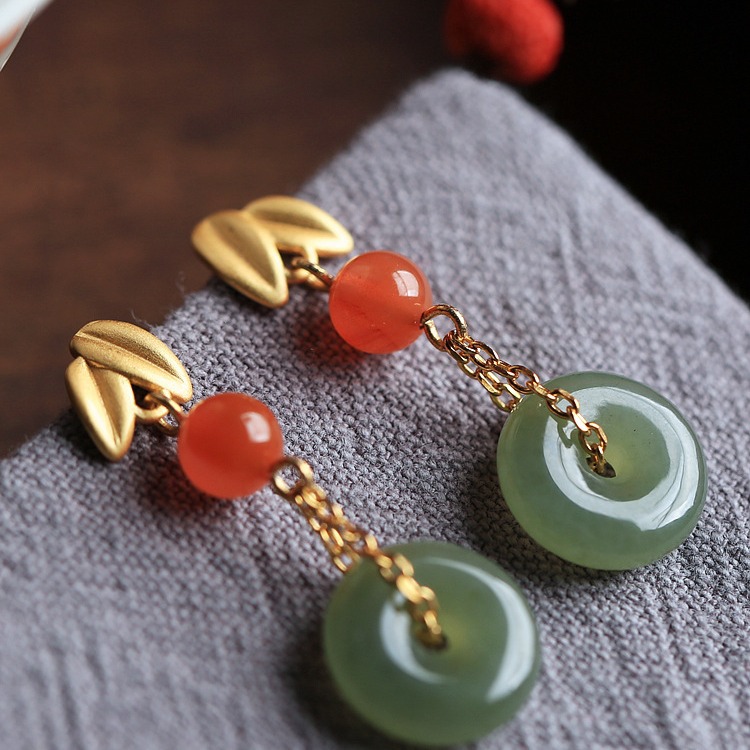 纯银古法金和田平安扣中国风复古气质流苏耳环女耳坠耳饰