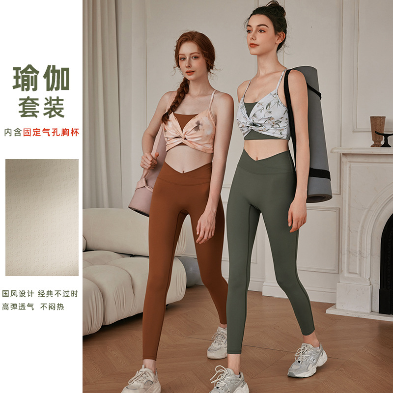 国风印花瑜伽服套装女浪漫美背固定胸垫上衣提臀收腹训练裤两件套