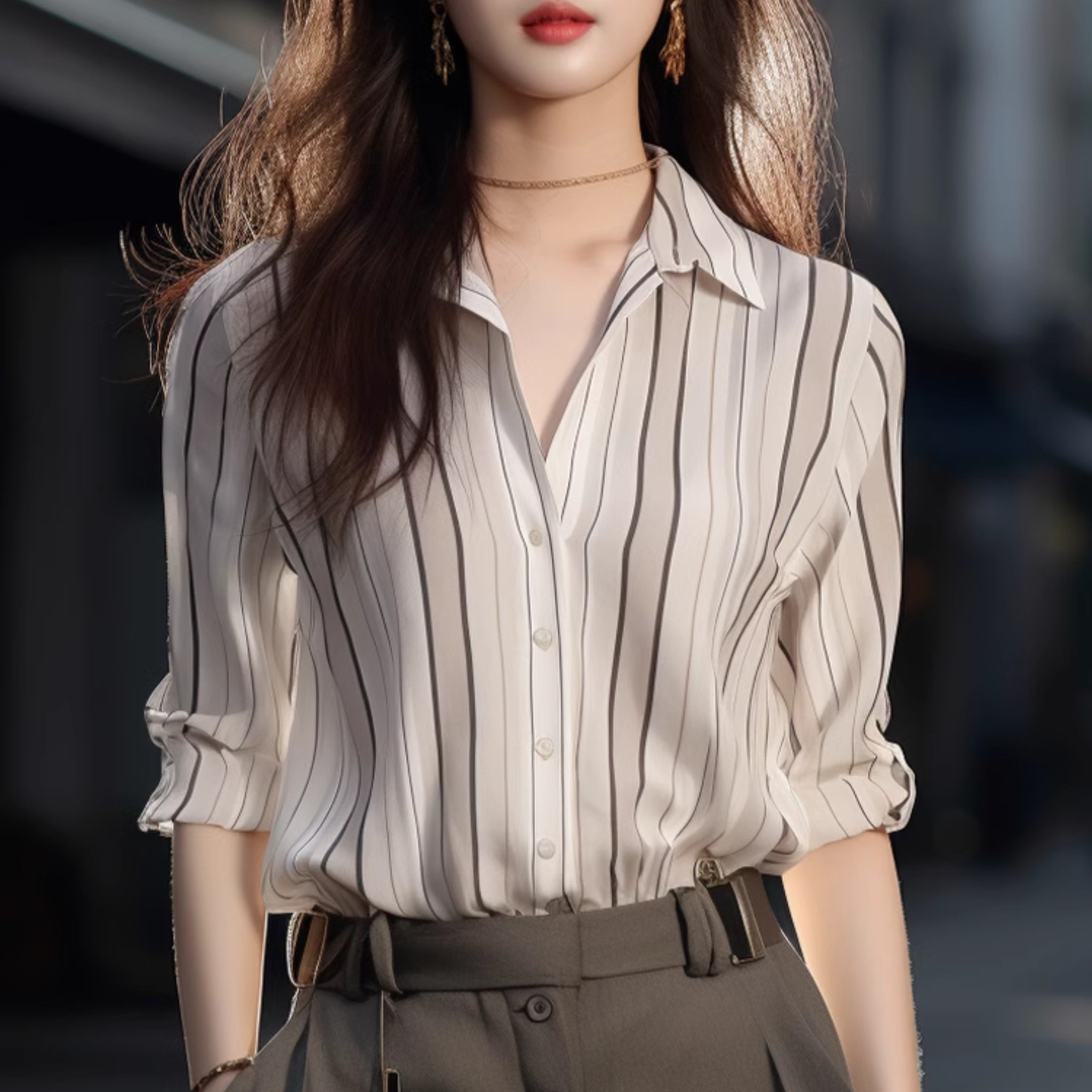 独特漂亮法式气质轻熟雪纺上衣夏季高级感海妖风通勤真丝条纹衬衫