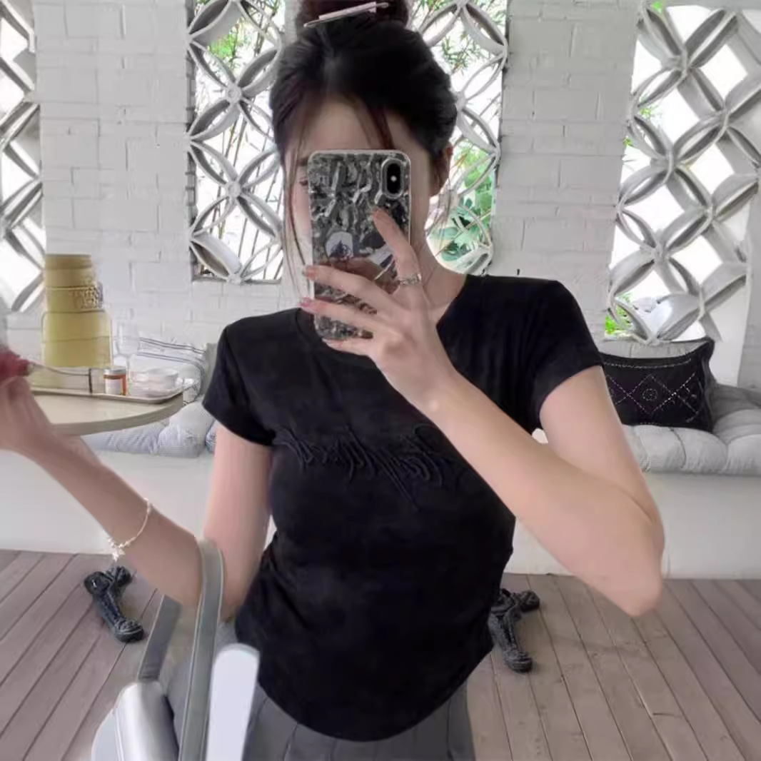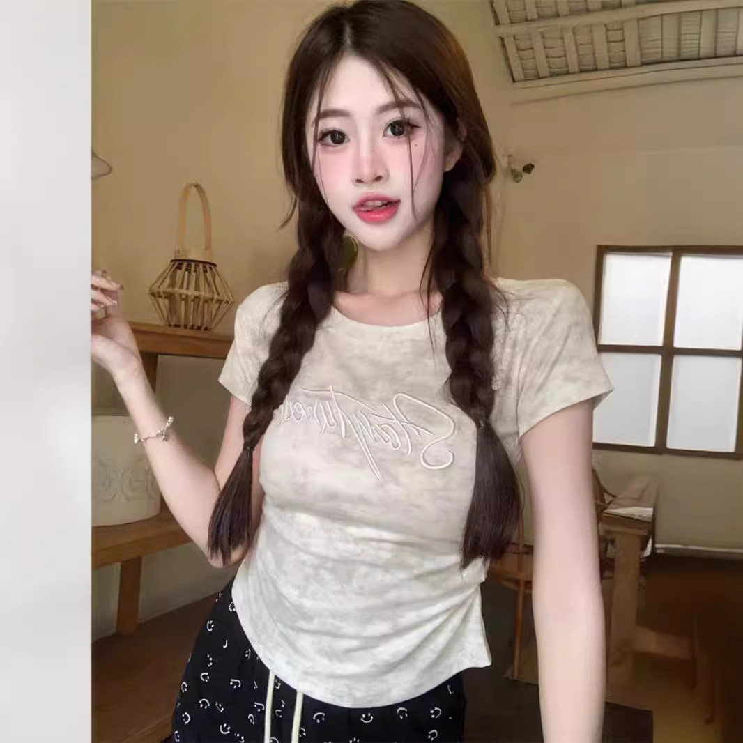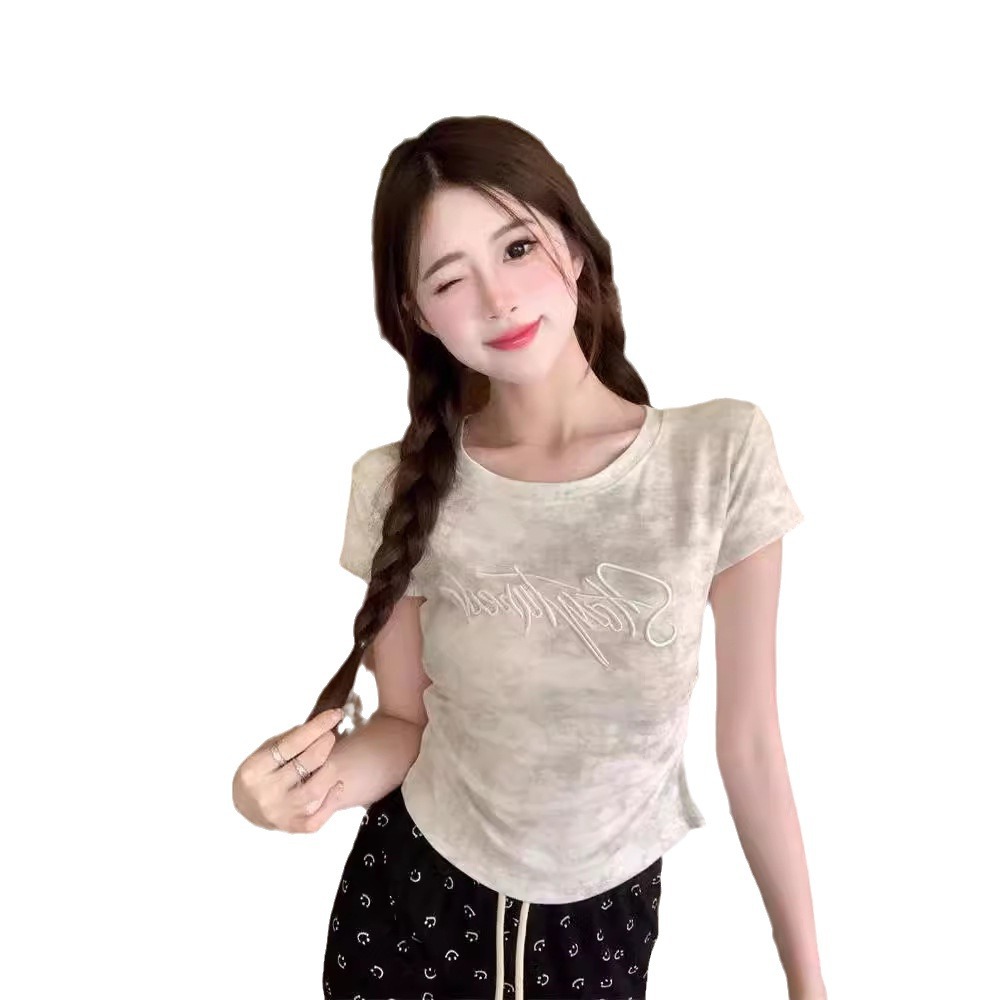 V领绣花甜辣妹夏季新款短款莫代尔上衣短袖t恤女修身百搭显瘦高腰