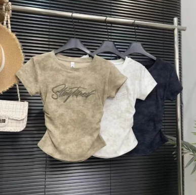 螺纹棉美式复古收腰褶皱扎染短袖t恤夏季新款不规则显瘦修身上衣