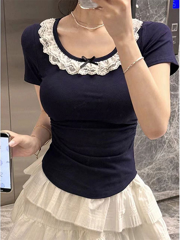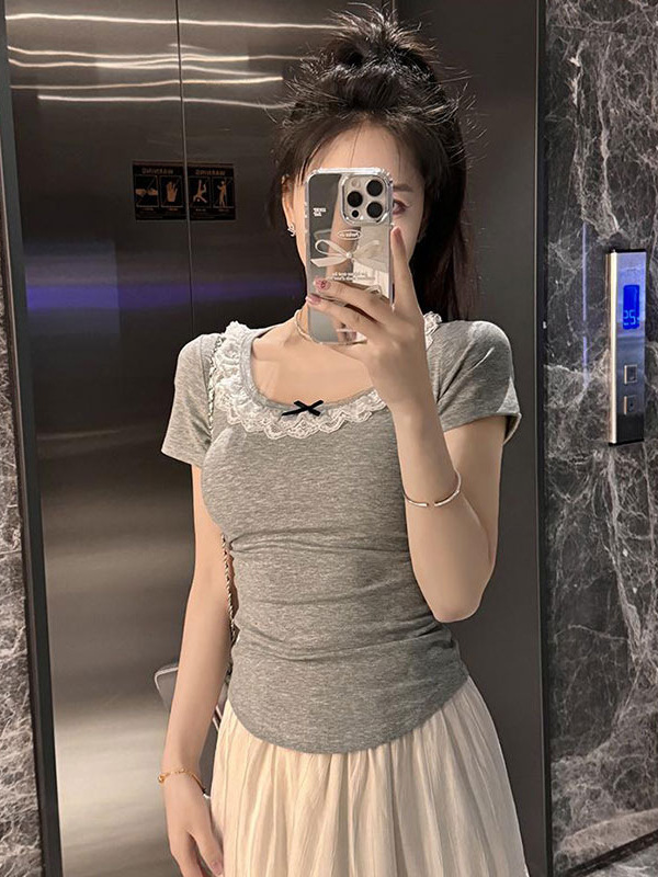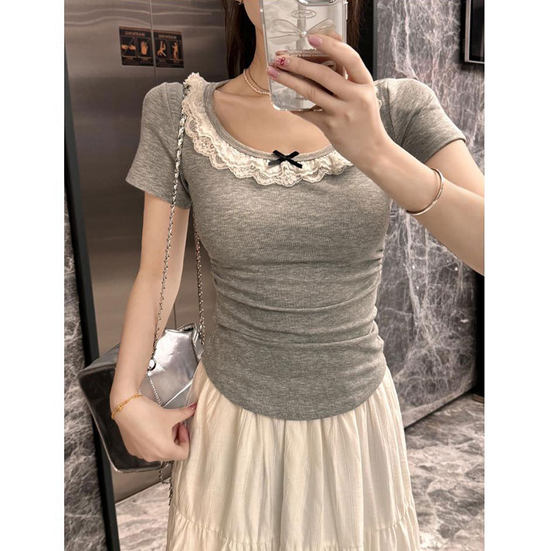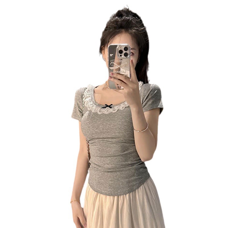 纯欲风灰色蕾丝短袖T恤女夏季2025新款蝴蝶结甜辣妹修身短款上衣