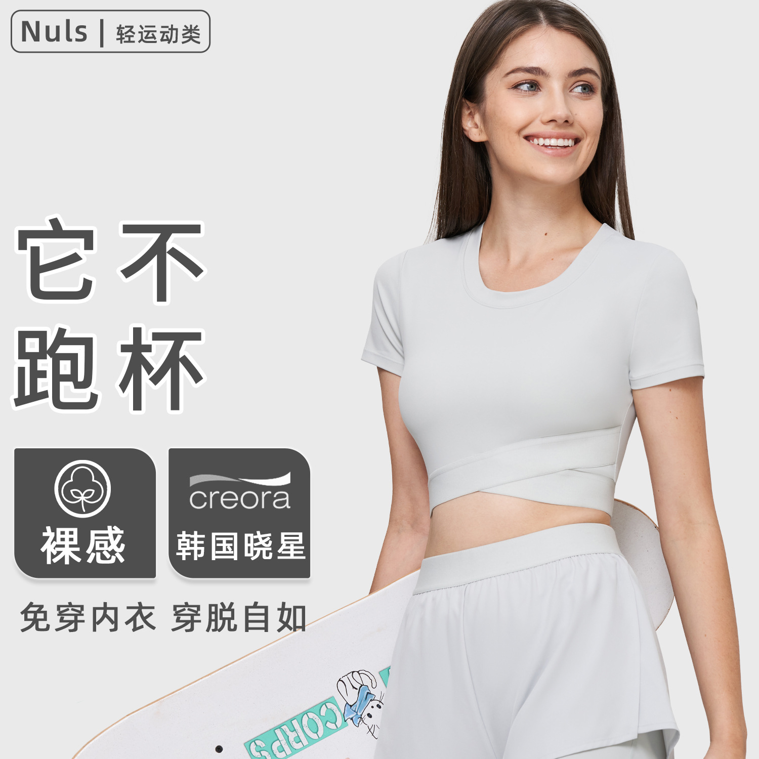NULS裸感瑜伽短袖固定罩杯运动内衣女夏季交叉下摆短款瑜伽服上衣
