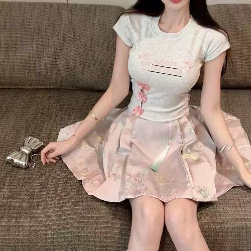 蝴蝶结字母刺绣减龄甜美短款短袖T恤女夏正肩辣妹露脐设计感上衣
