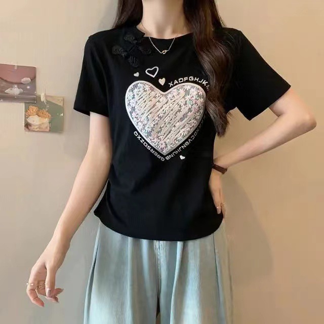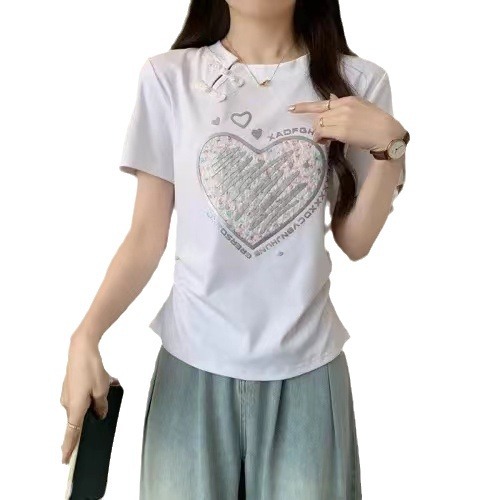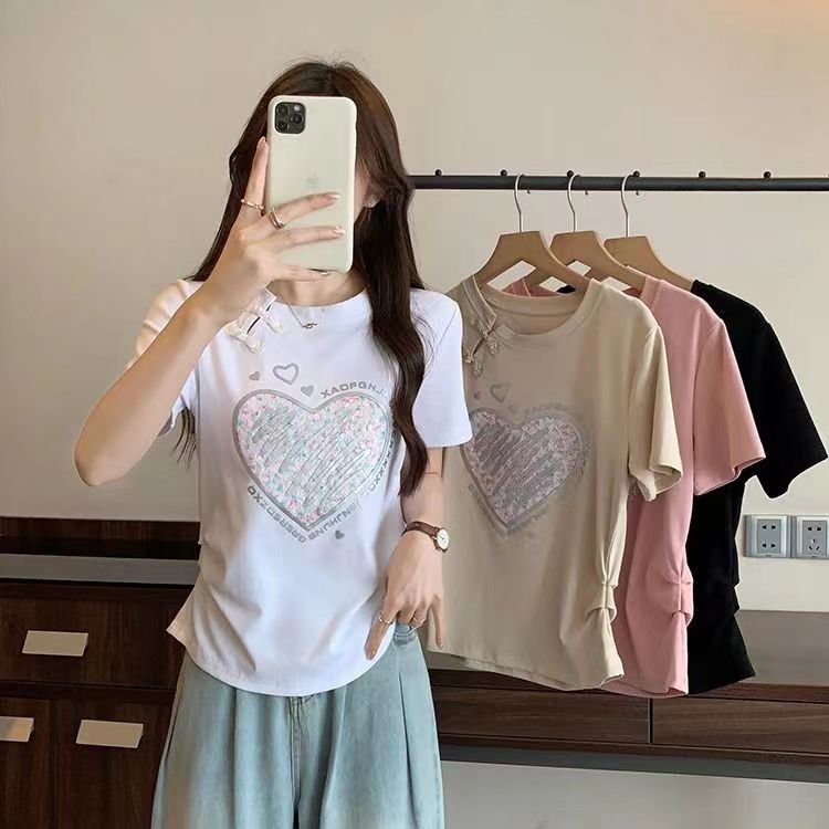 2025夏季女新中式盘扣螺纹棉短袖女t恤重工设计感洋气显瘦百搭