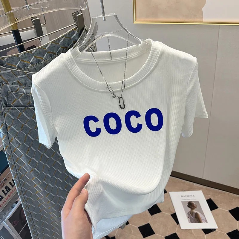 欧洲站圆领字母印花螺纹短袖T恤女夏季新款纯欲风不规则开叉上衣