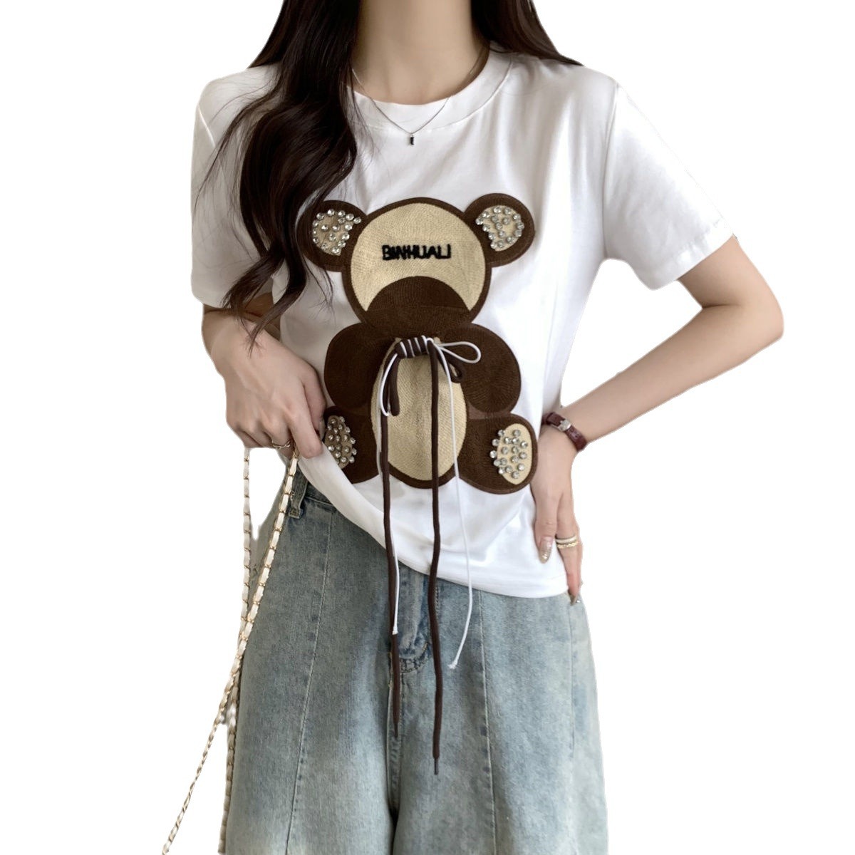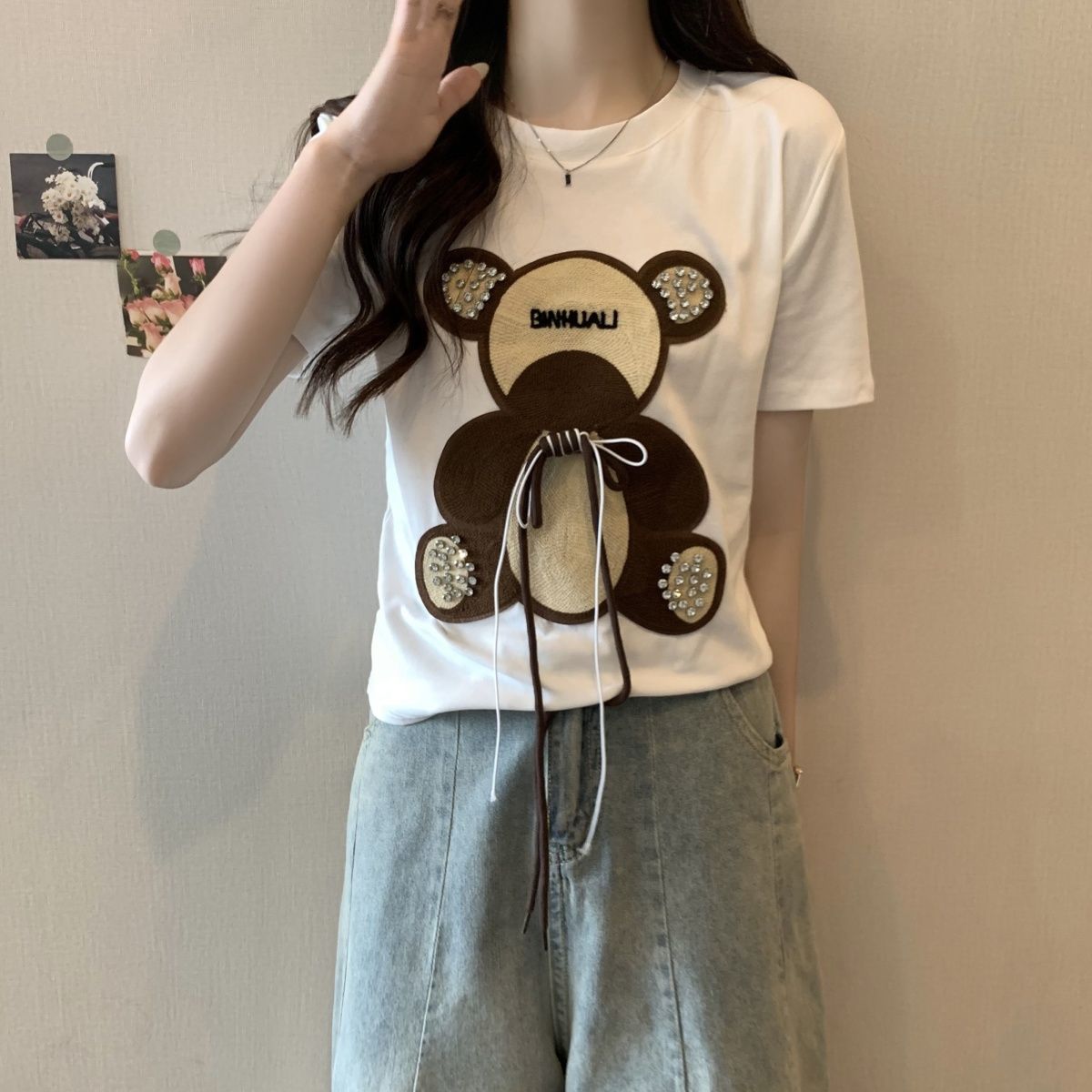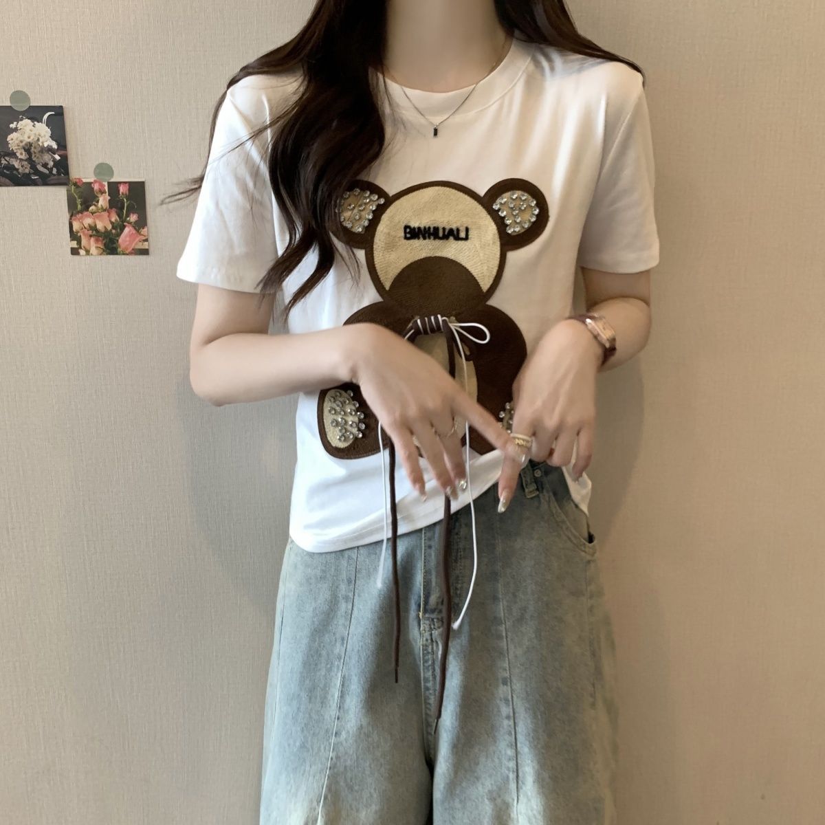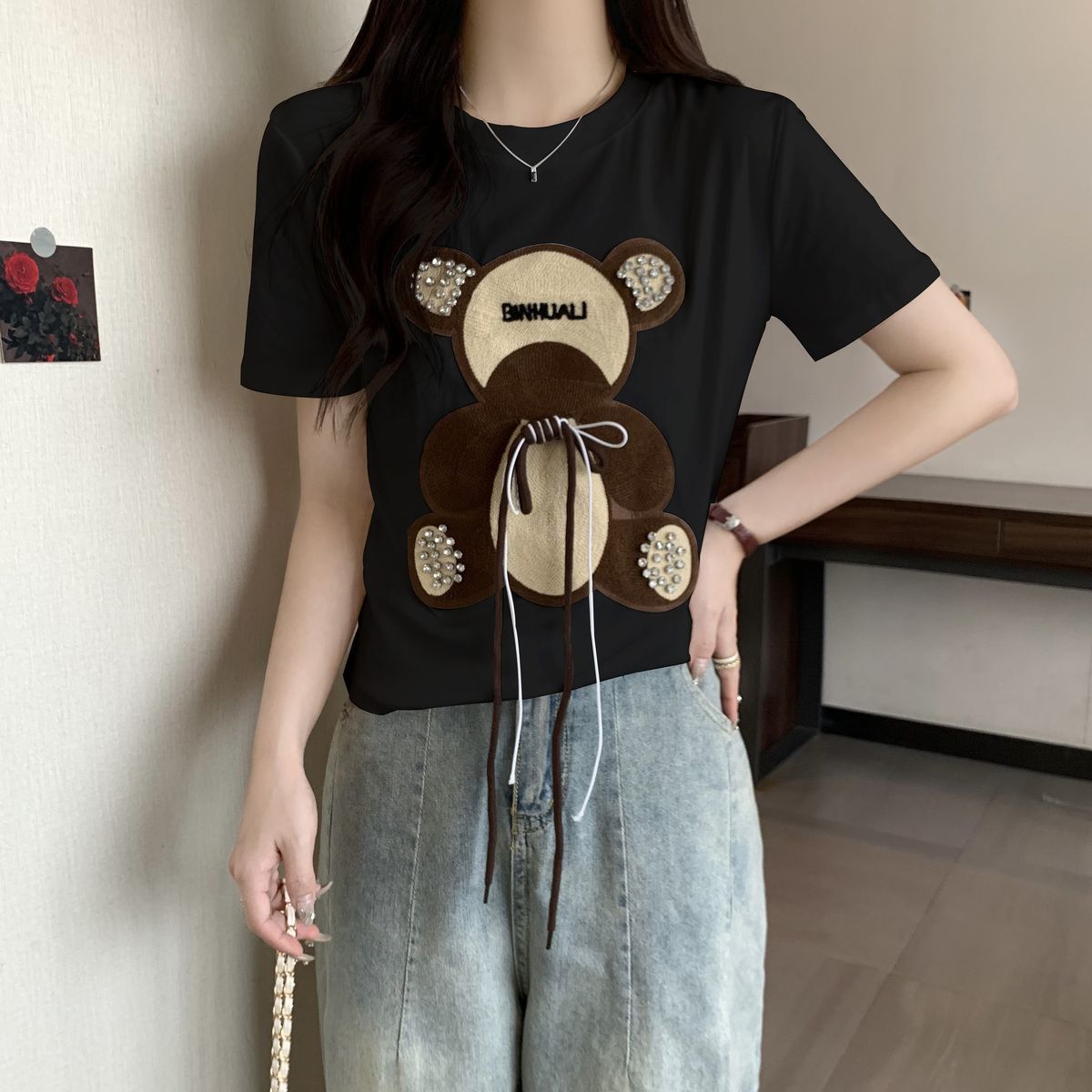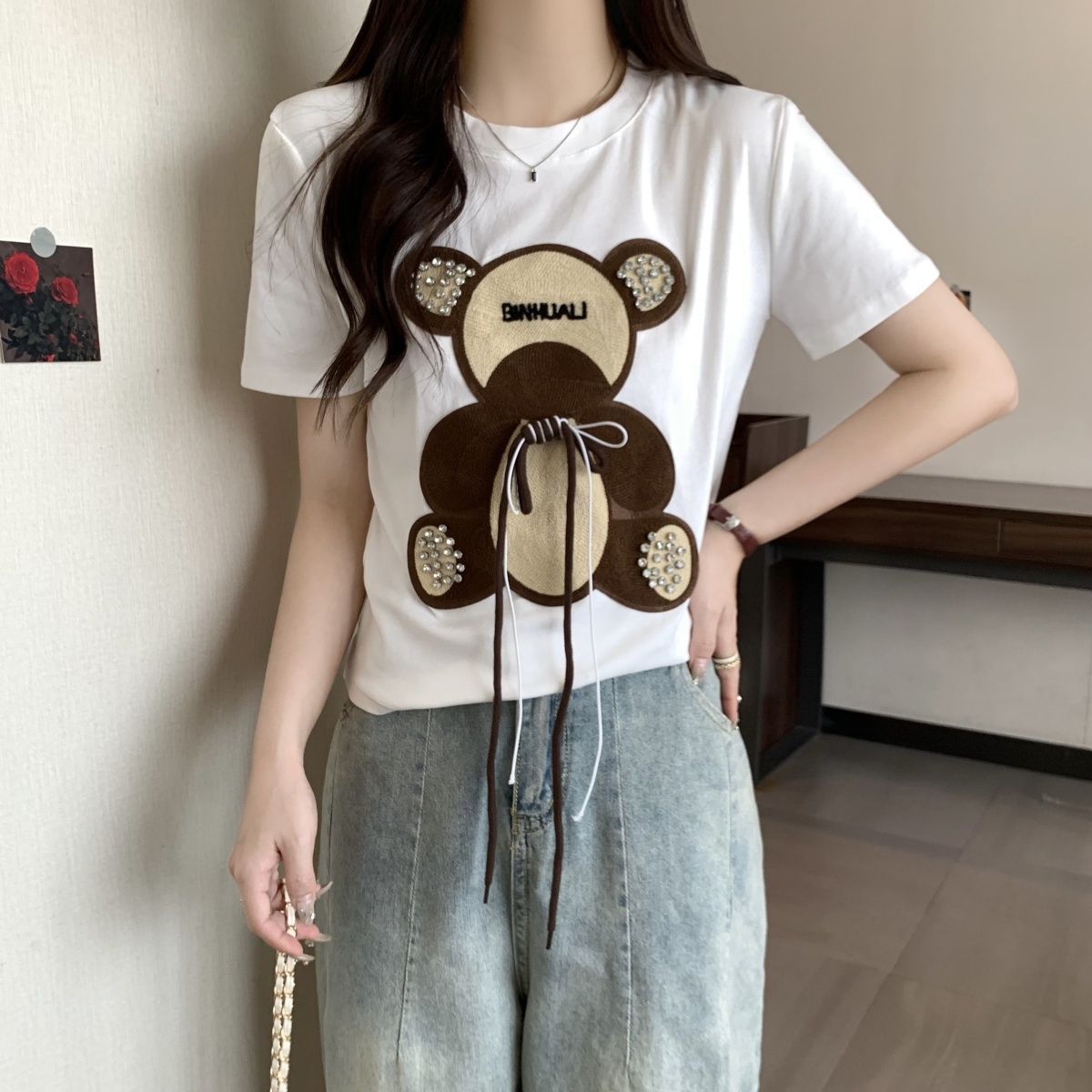 欧货重工烫钻刺绣小熊短袖T恤女夏季小个子百搭洋气减龄短款上衣