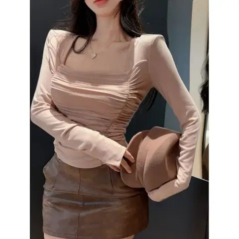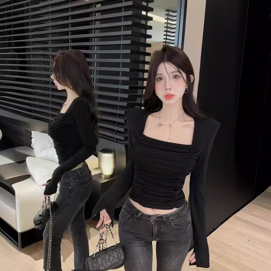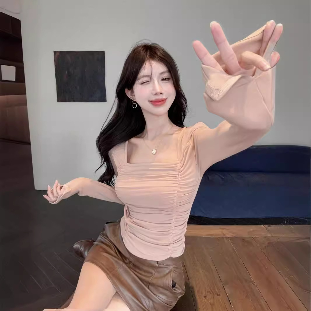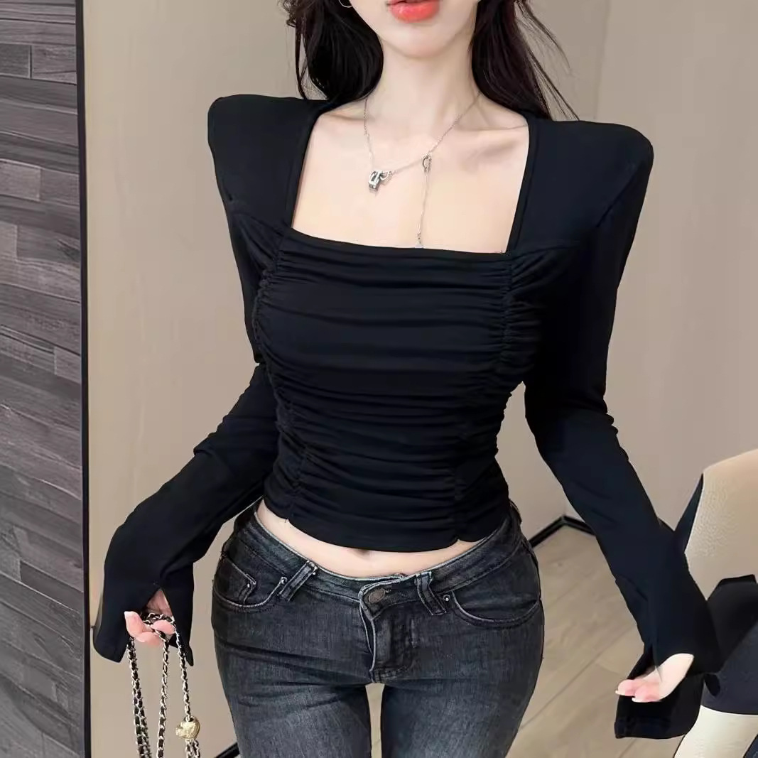 纯欲热辣风短款方领褶皱弹力长袖t恤女2025新款爆款洋气时髦欧货