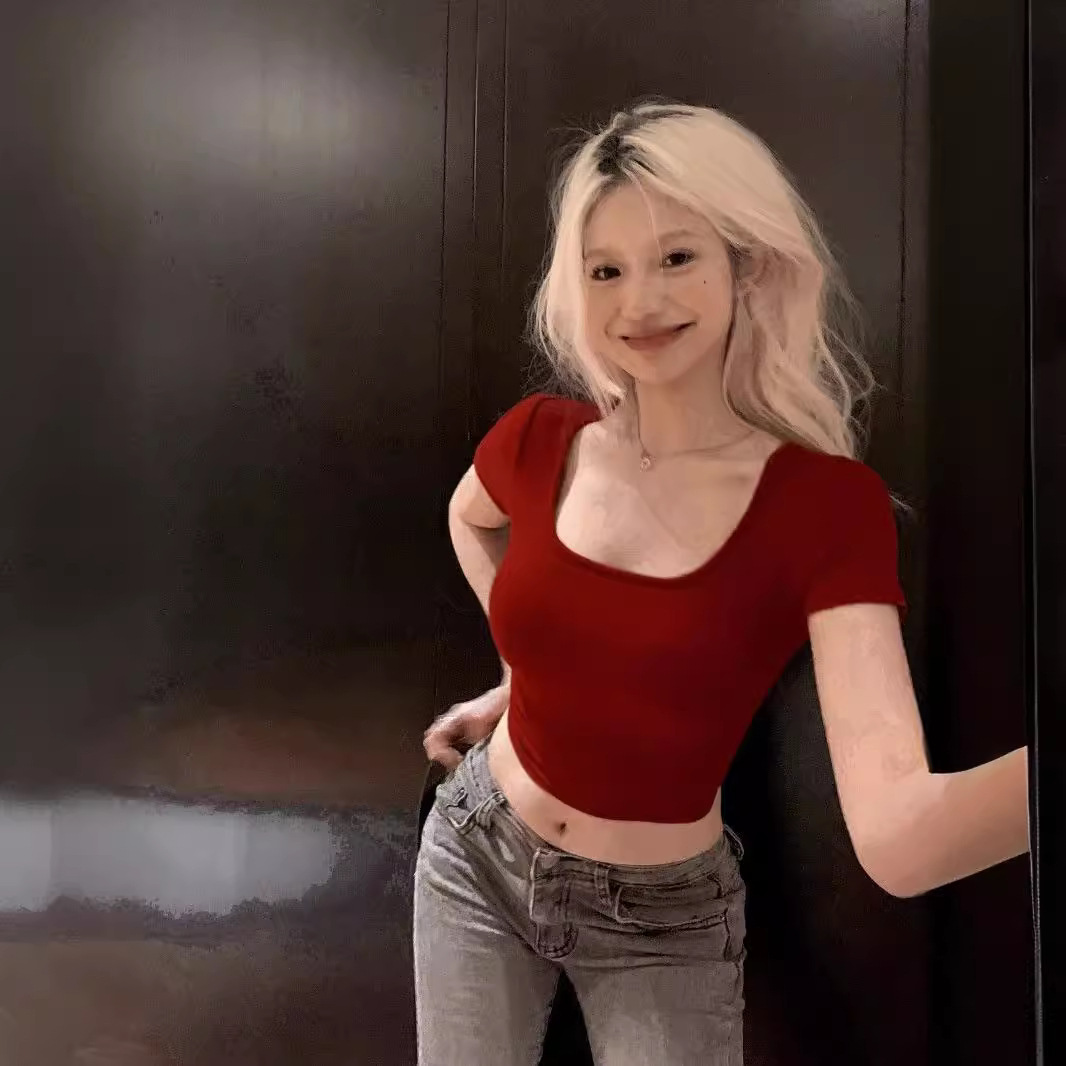 多巴胺穿搭短袖正肩T恤女夏季红色镂空露背性感短款修身上衣女