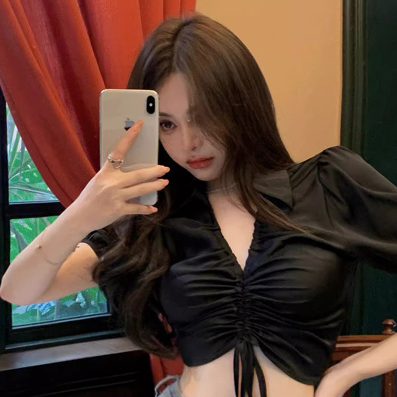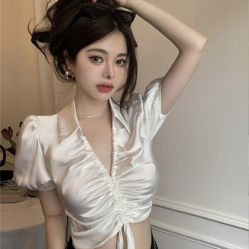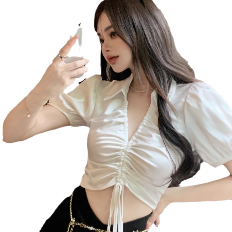 设计感POLO领短袖衬衫女夏季高腰短款小众泡泡袖抽绳翻领衬衫上衣