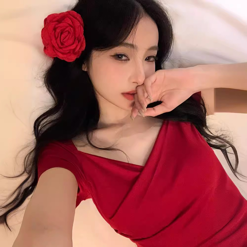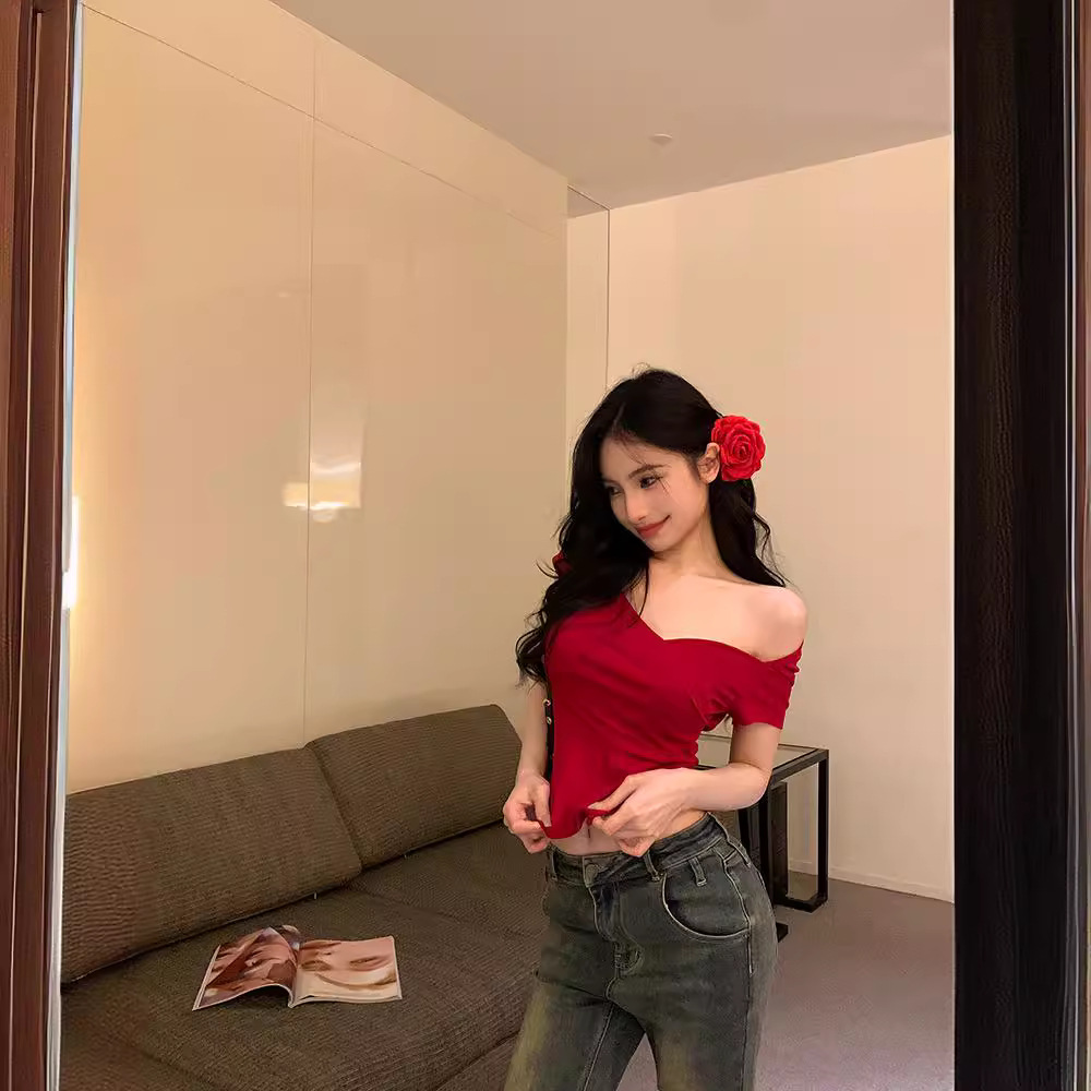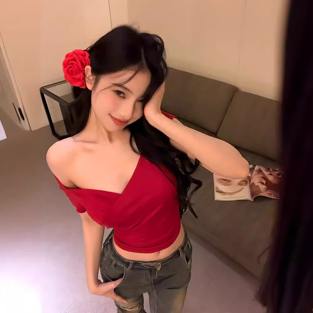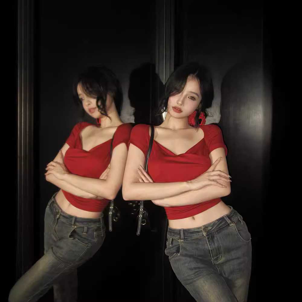 V领交叉辣妹短袖T恤女夏季收腰紧身气质红色短款小众美式性感上衣