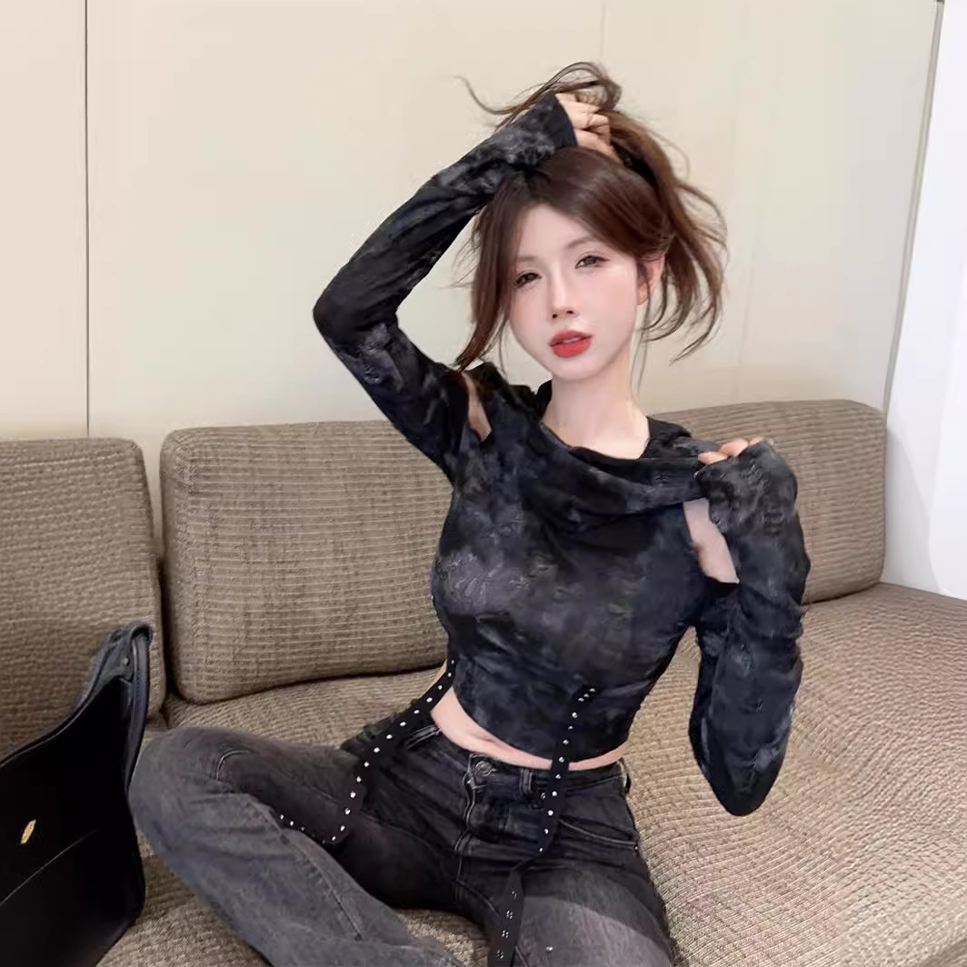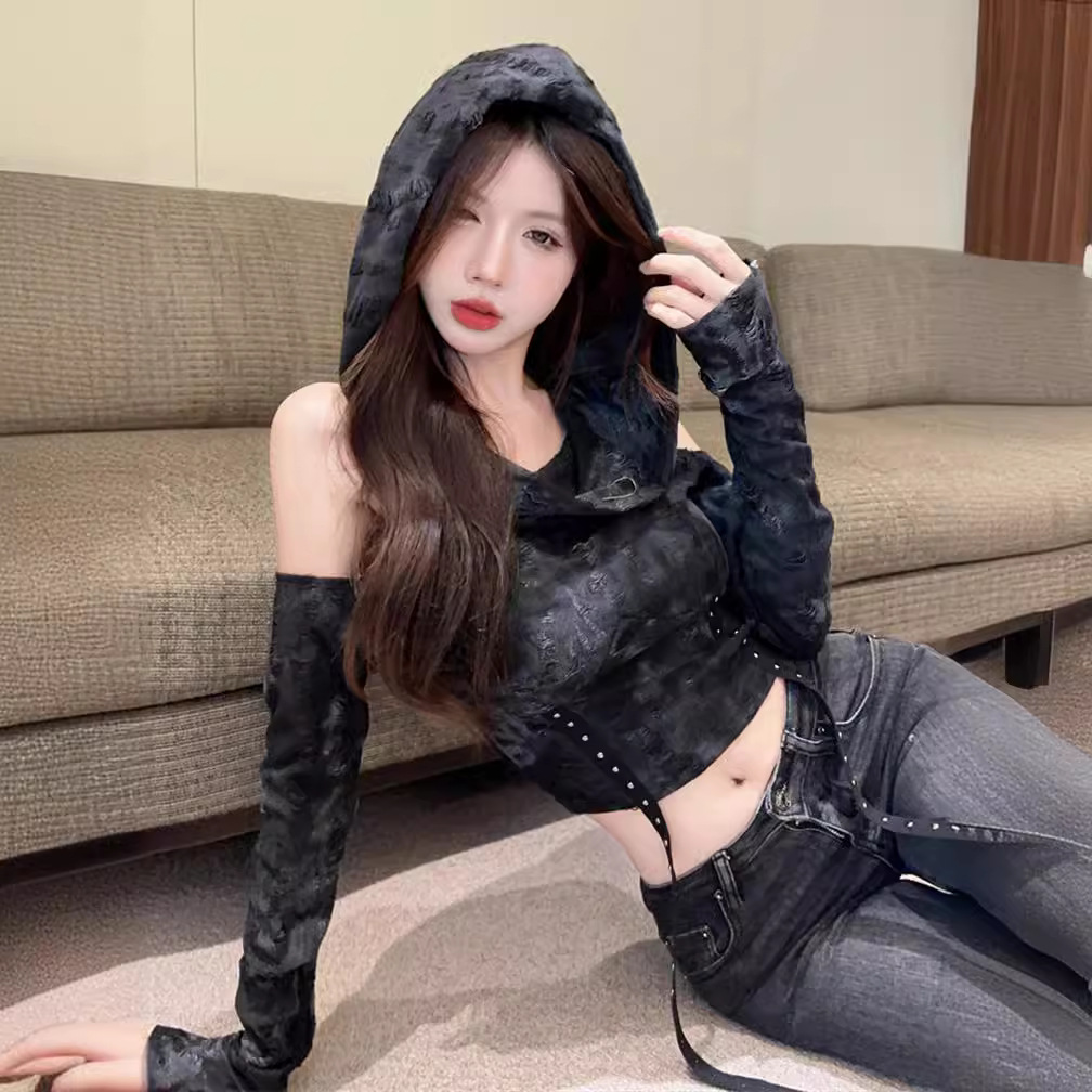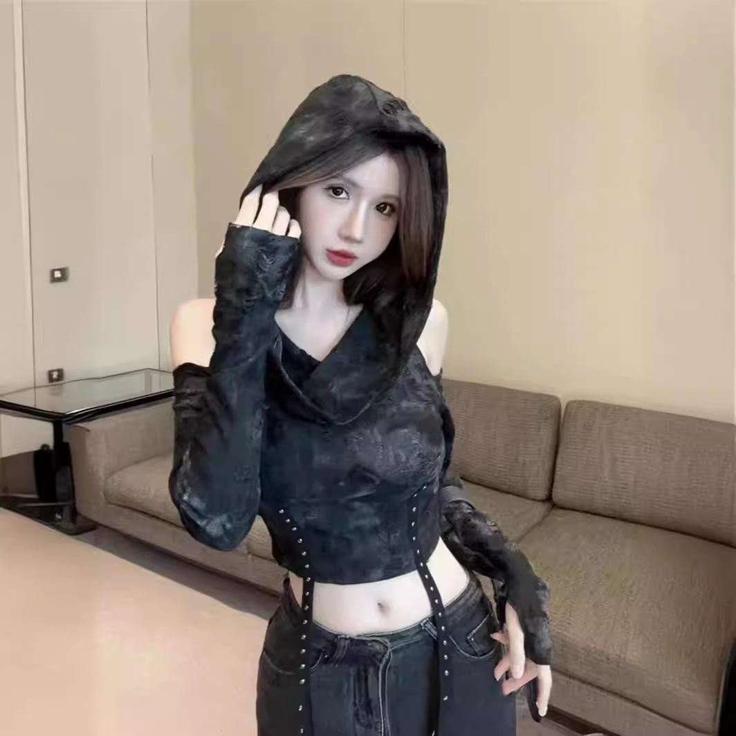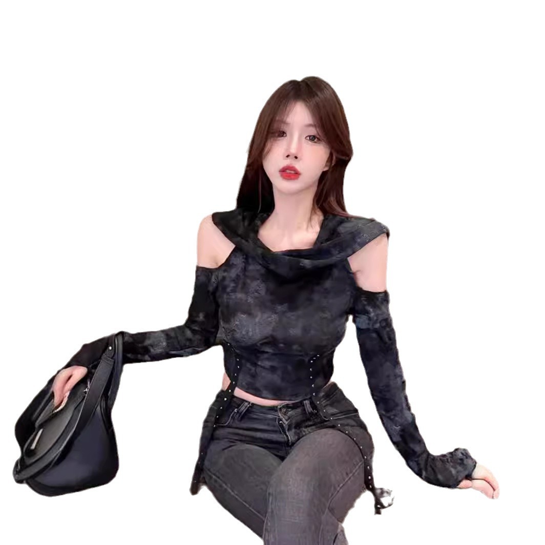 废土风手工磨破晕染连帽漏肩长袖T恤女显瘦高腰个性短款上衣