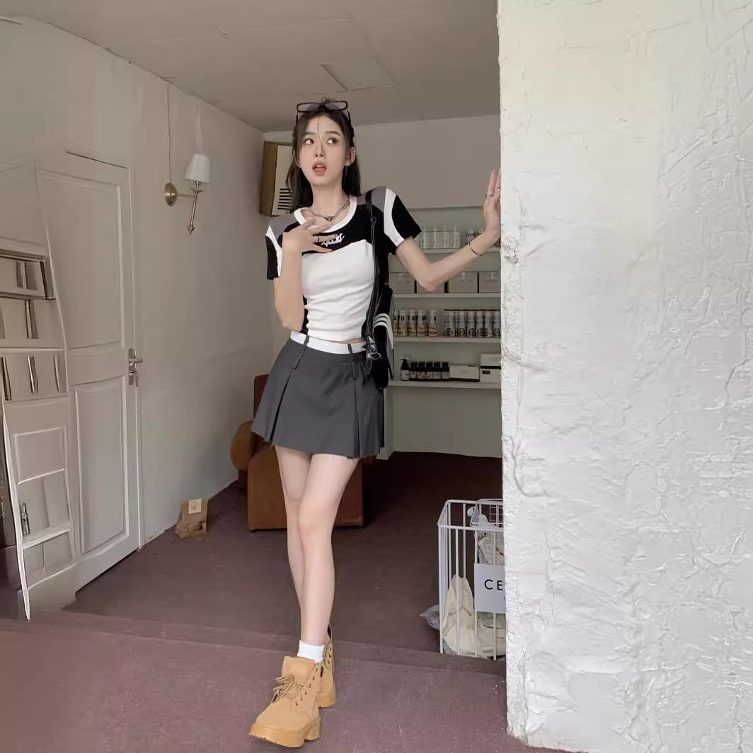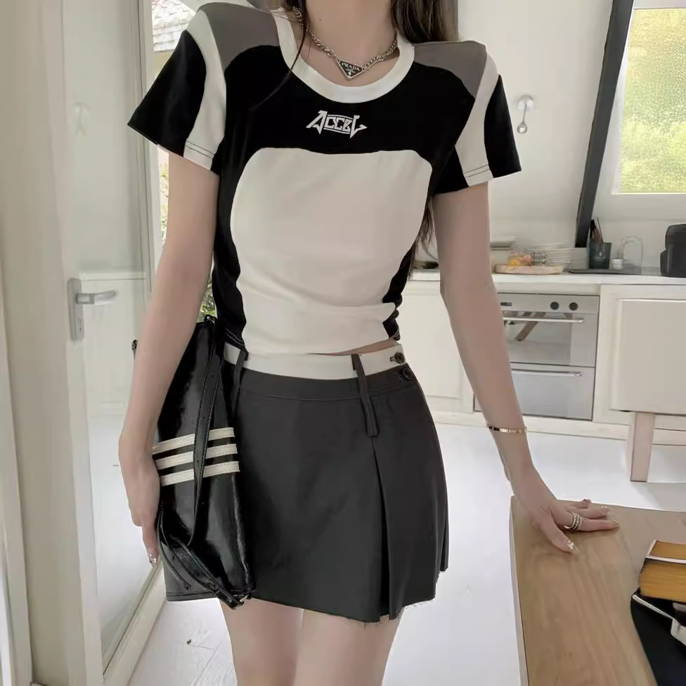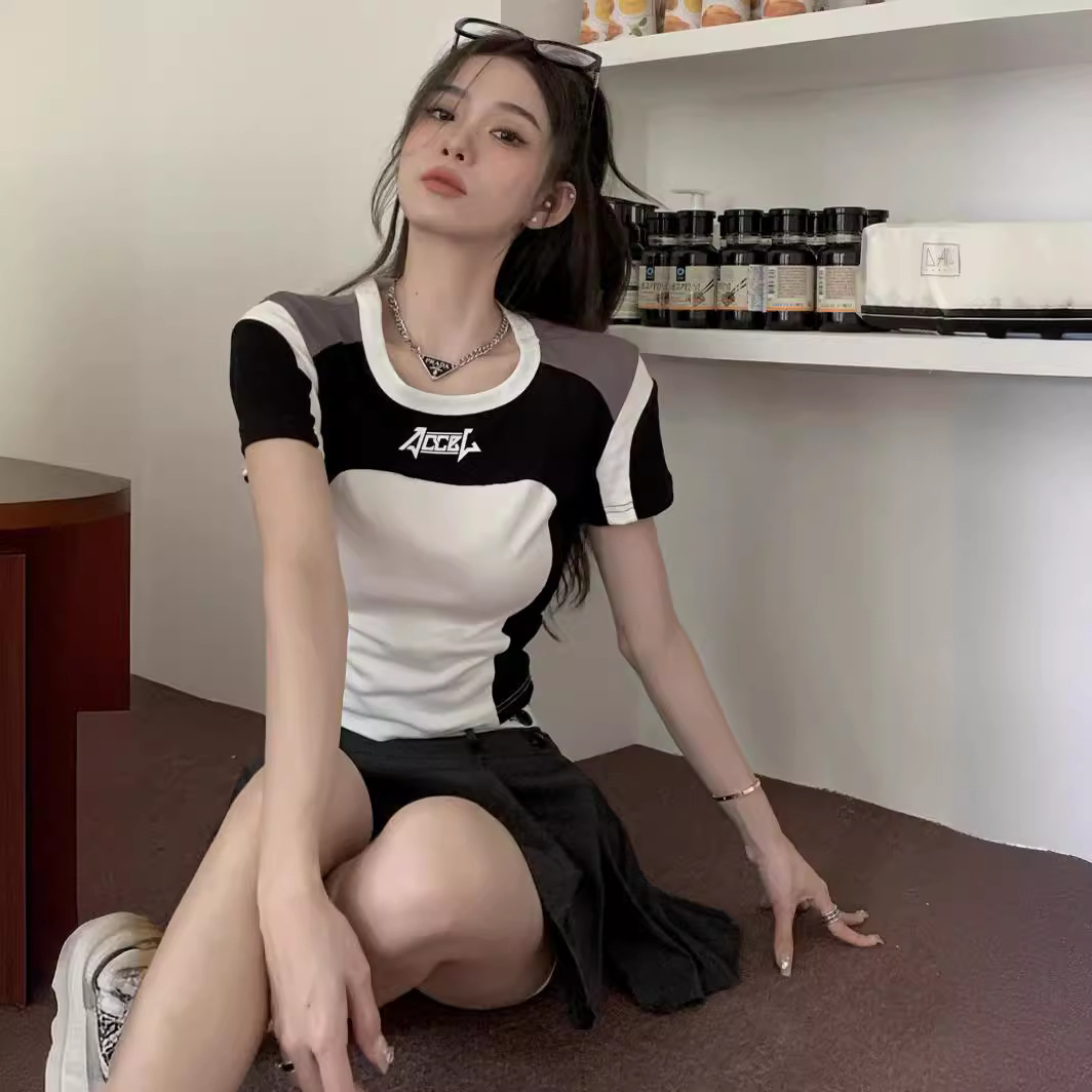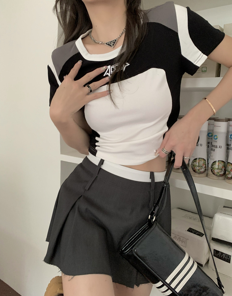 纯棉短款夏季辣妹拼接短袖T恤女短款上衣欧货爆款洋气时髦夏装