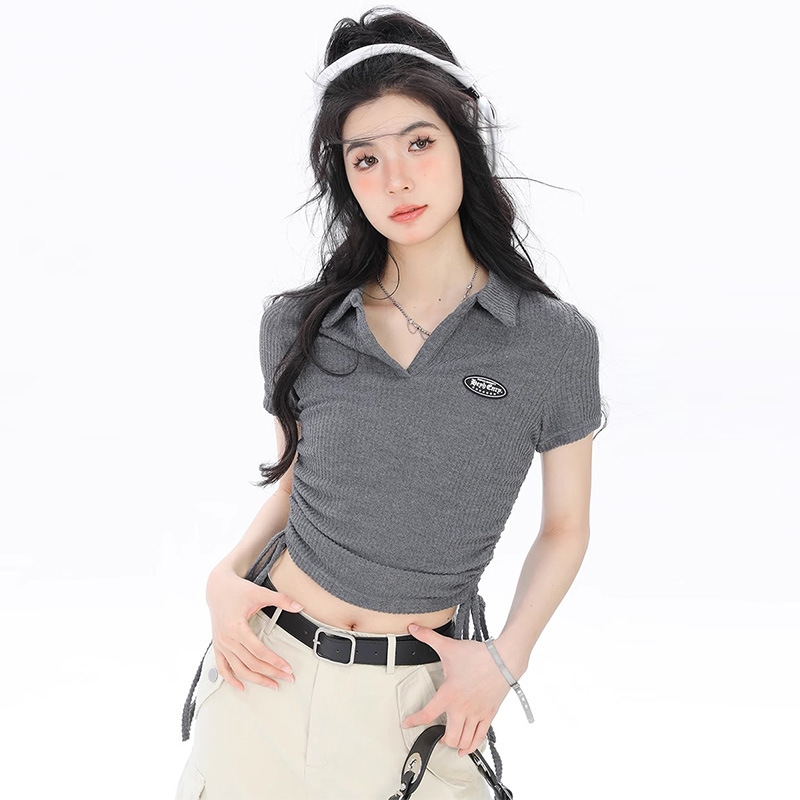 美式辣妹抽绳polo领短款上衣女收腰显瘦百搭设计感小众短袖T恤夏
