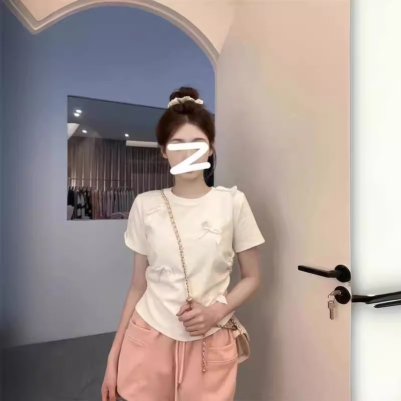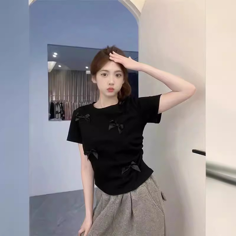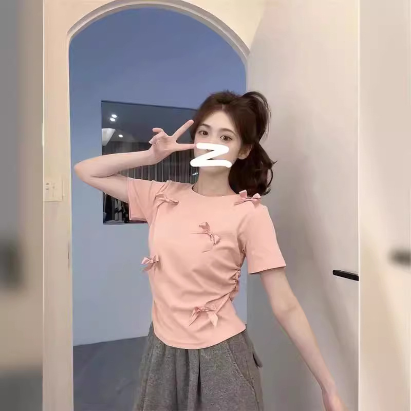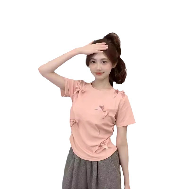设计感短袖正肩t恤女别致独特立体蝴蝶结韩系甜妹不露腰短款上衣