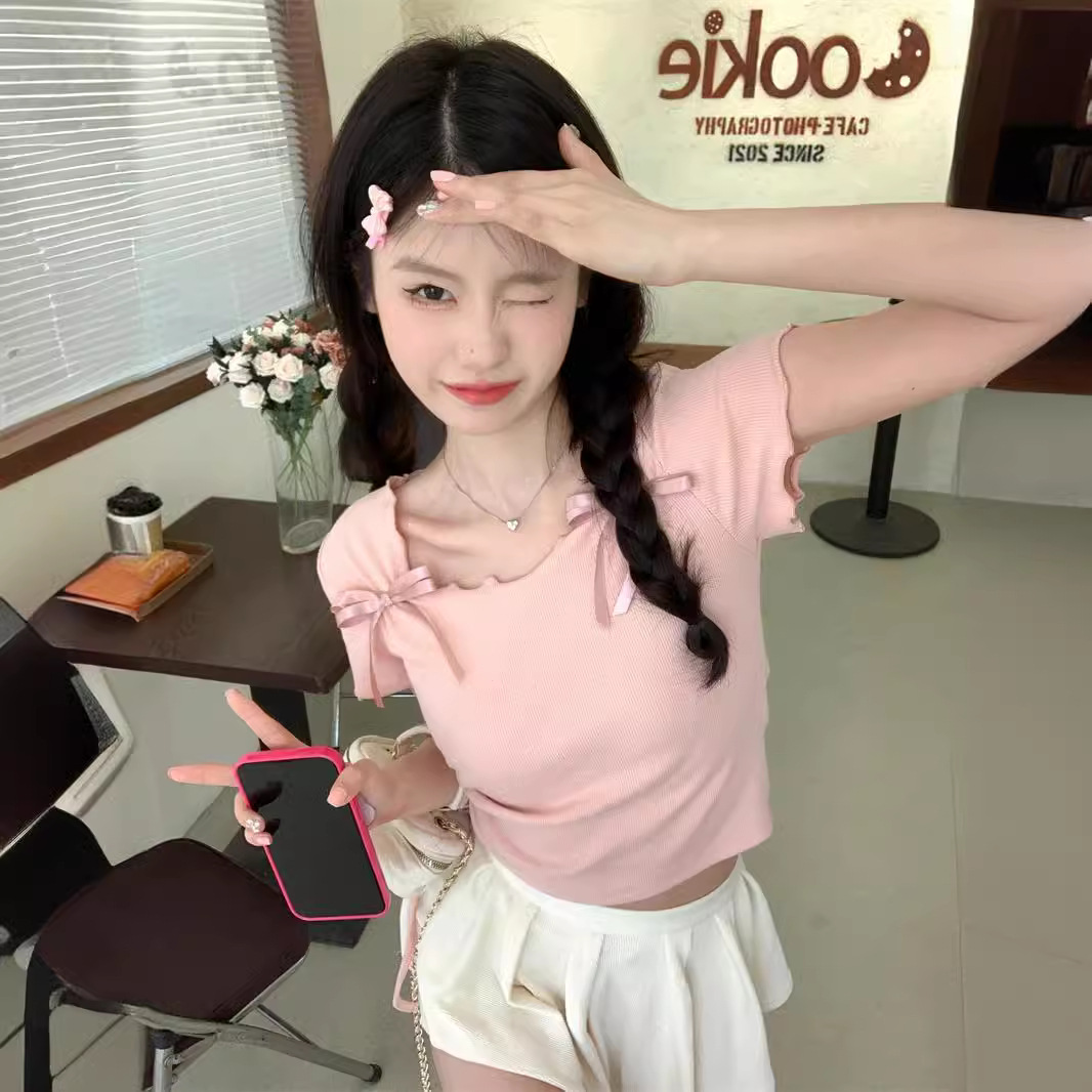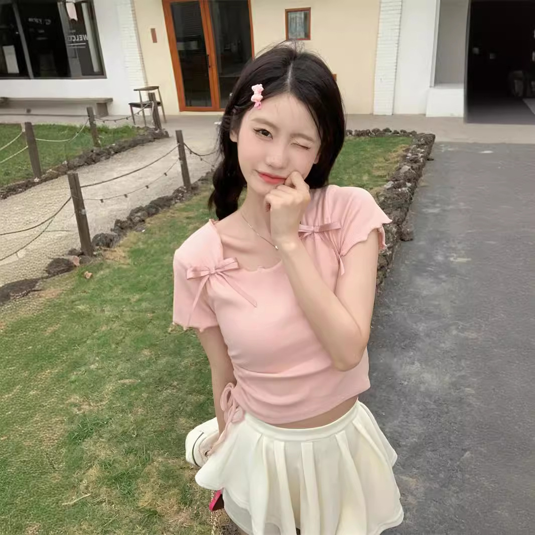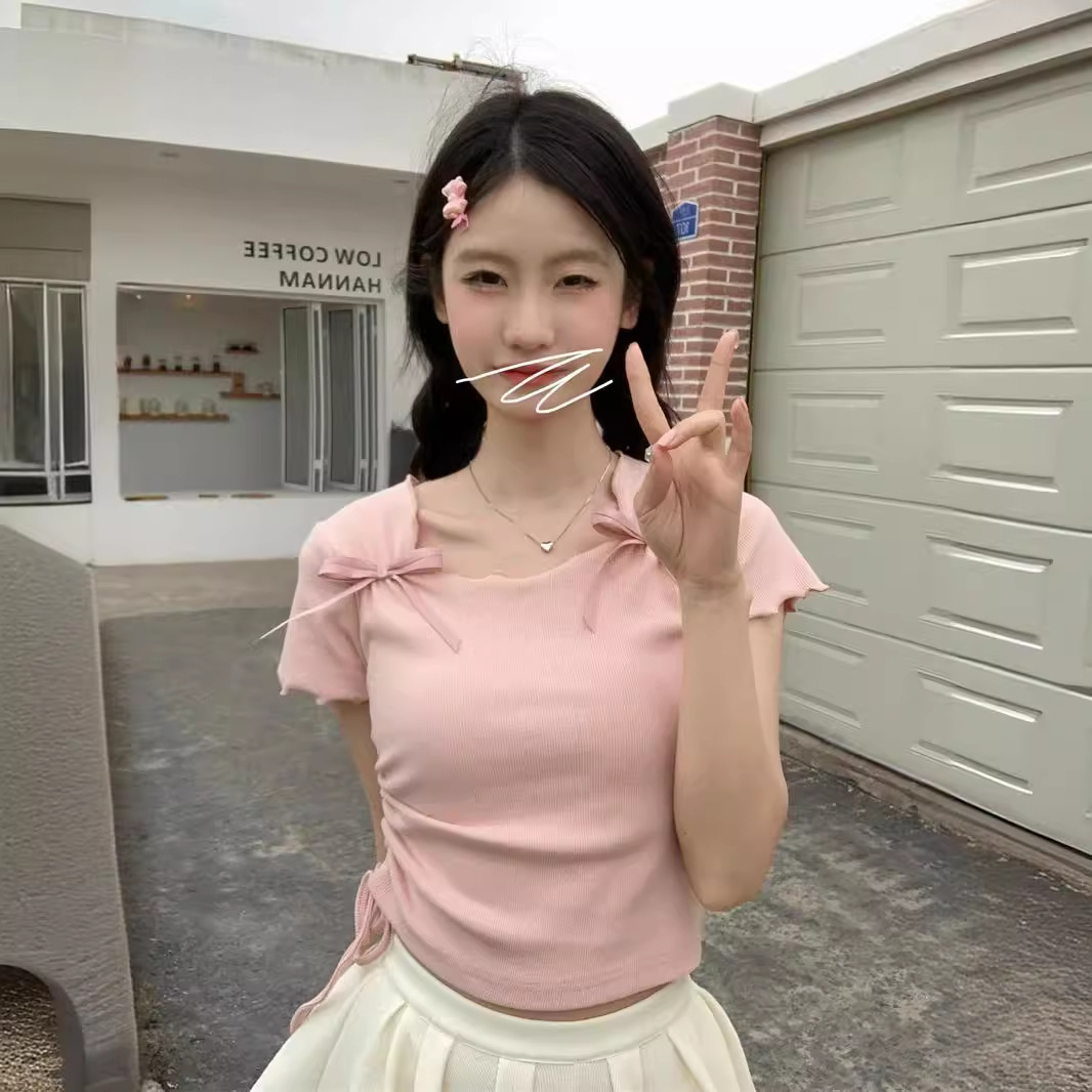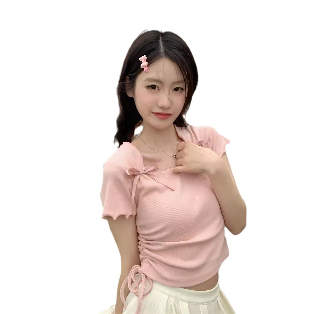 日系纯欲粉色短款t恤女夏季2025新款别致蝴蝶结抽绳修身短款上衣