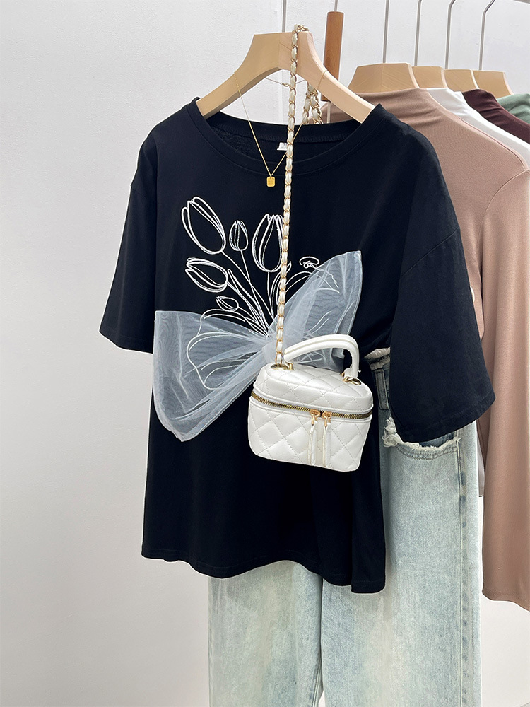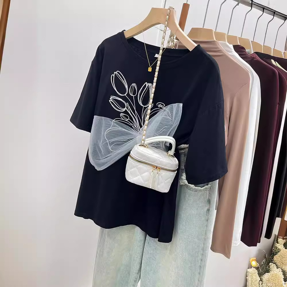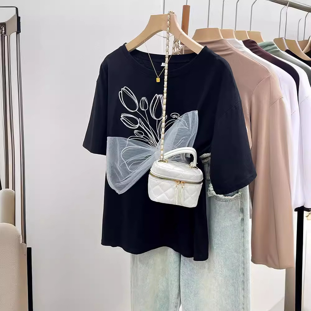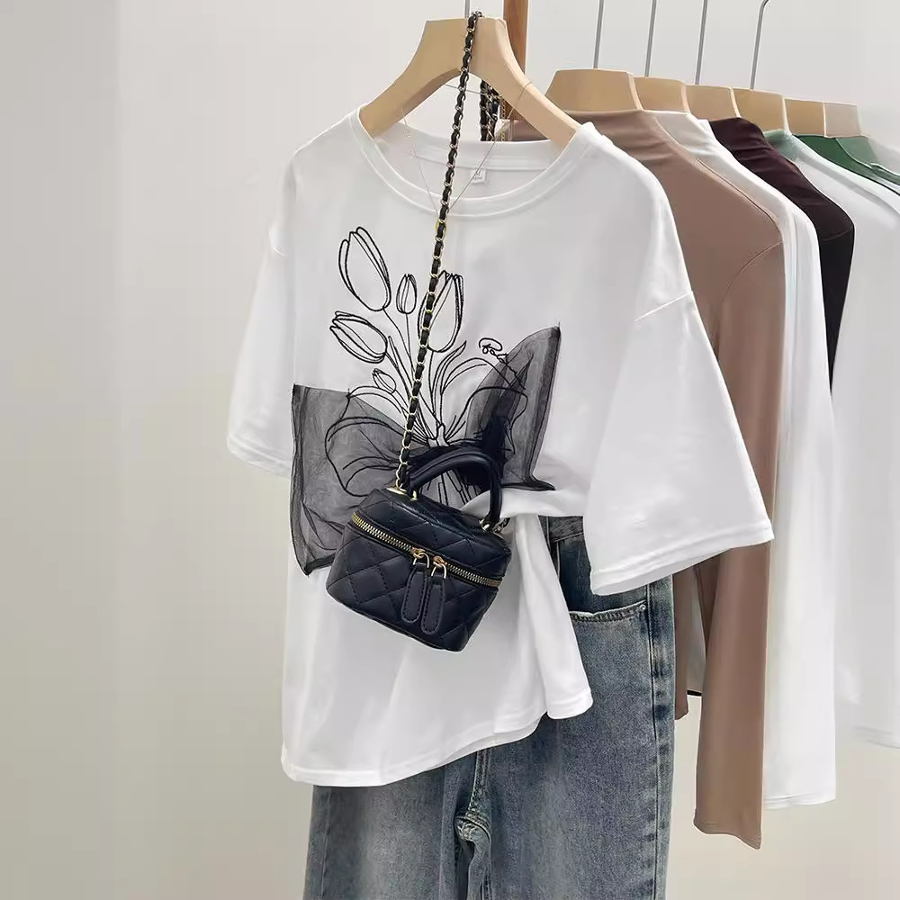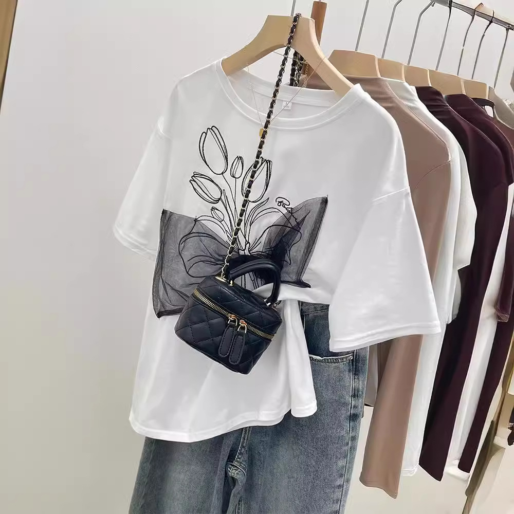 网纱拼接纯棉T恤女短袖2025年新款夏装宽松设计感小众上衣小个子