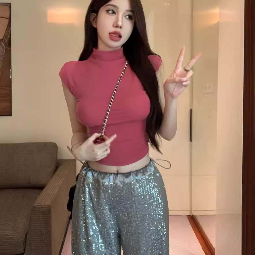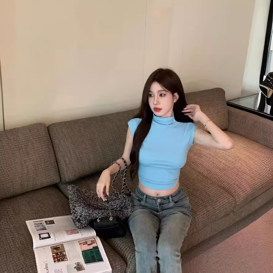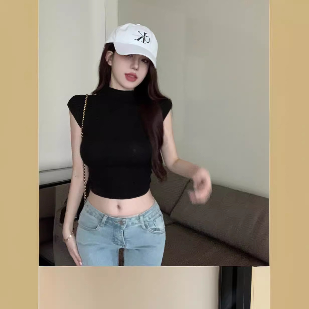 人棉性感露背短款上衣小众别致半高领短袖t恤女纯欲甜辣修身夜店