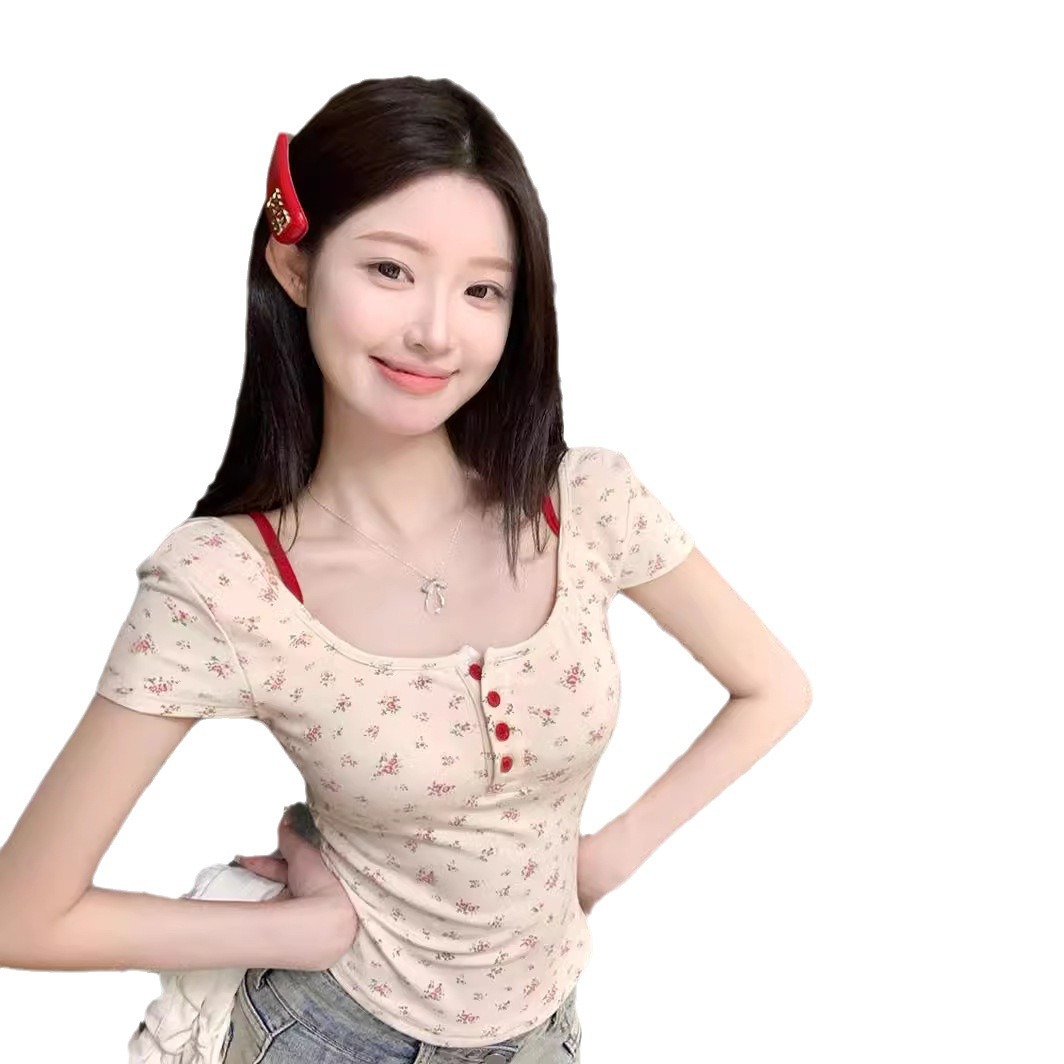 纯欲假两件碎花短袖T恤女夏季设计感带胸垫露背修身绝美短款上衣