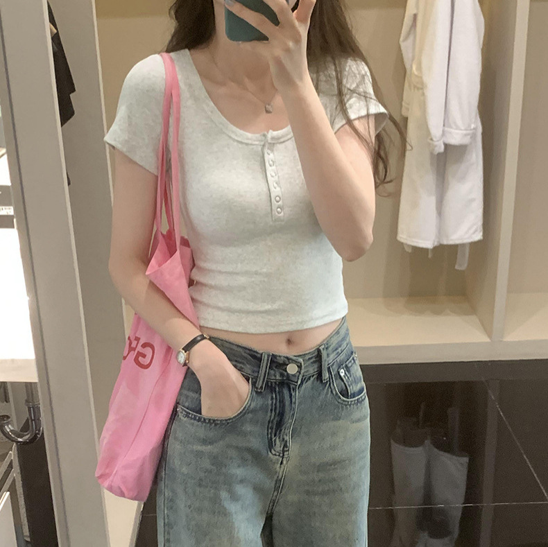 纯欲风正肩U领短袖t恤女夏季设计感小众修身显瘦辣妹纽扣基础上衣