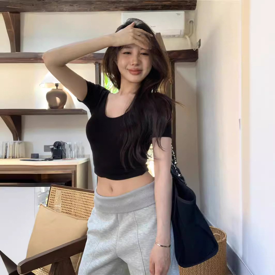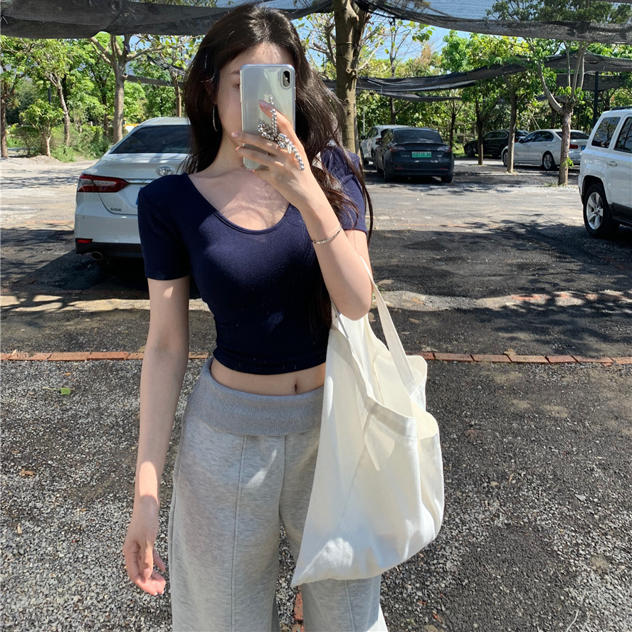 藏蓝色纯欲U领修身显瘦休闲短袖T恤女夏季2025新款辣妹高腰短上衣