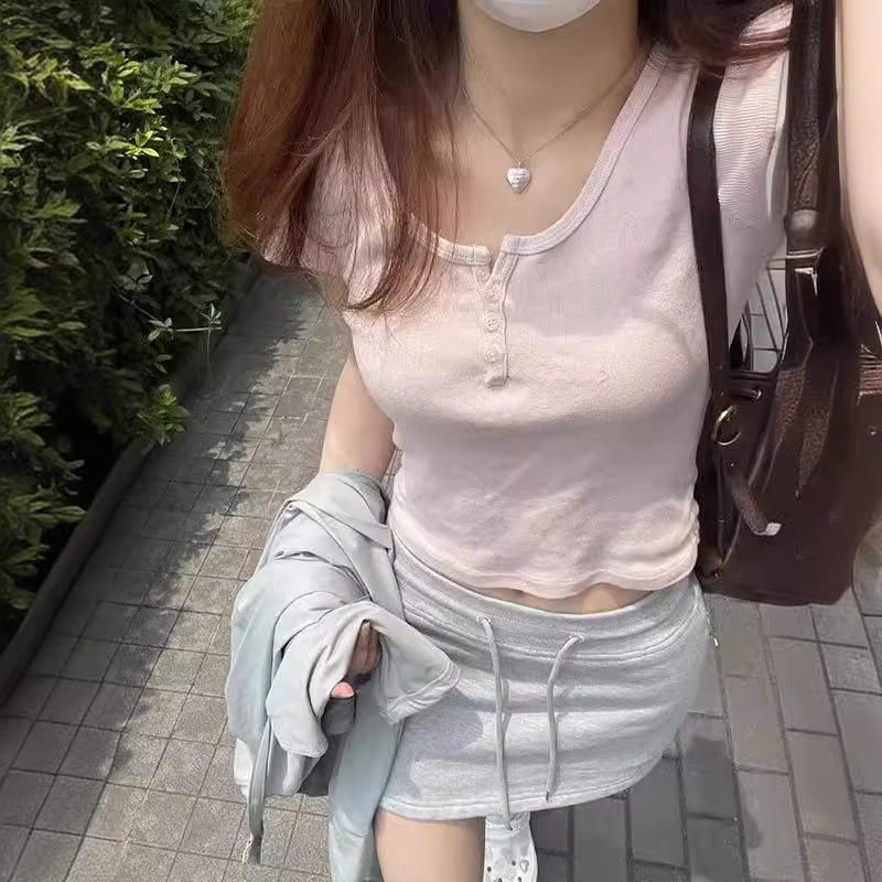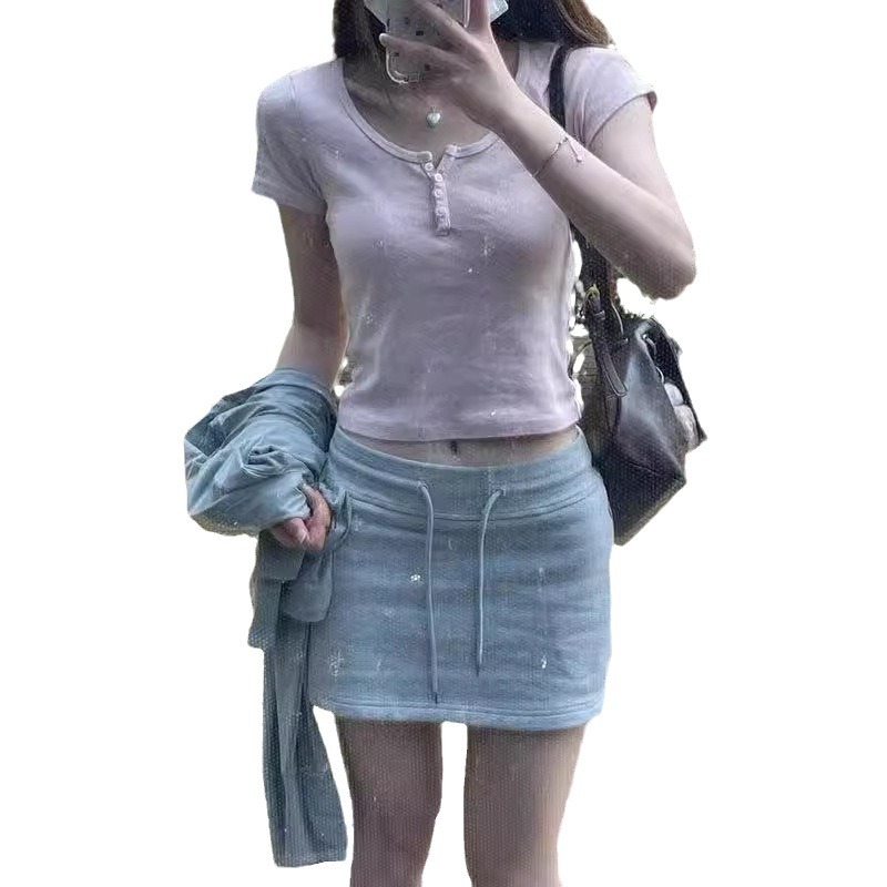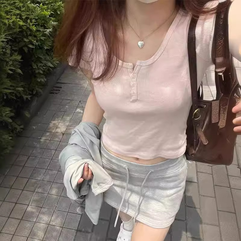 纯欲风甜辣粉色正肩t恤女短袖夏季修身显瘦辣妹紧身短款上衣