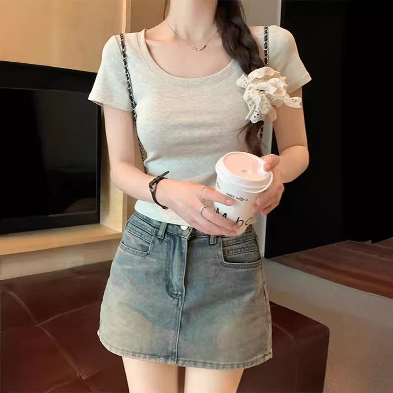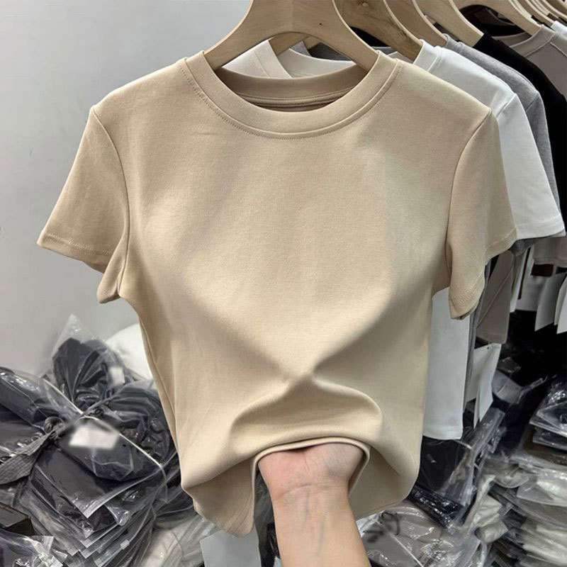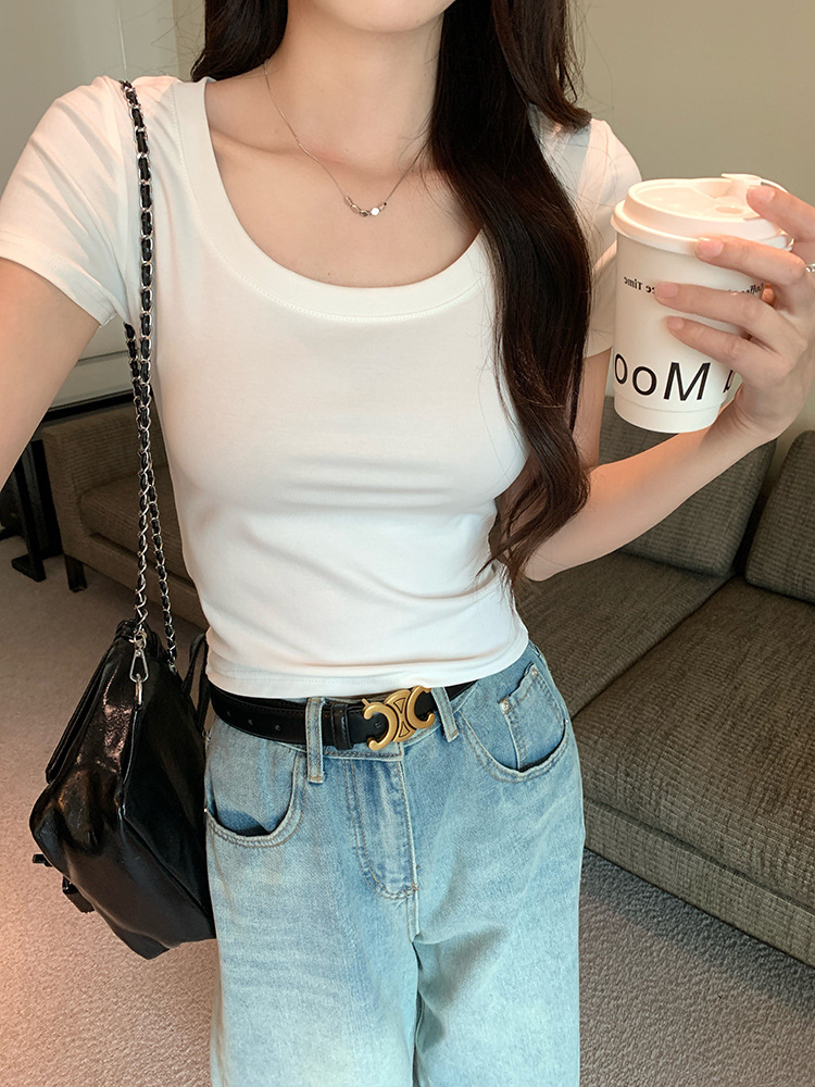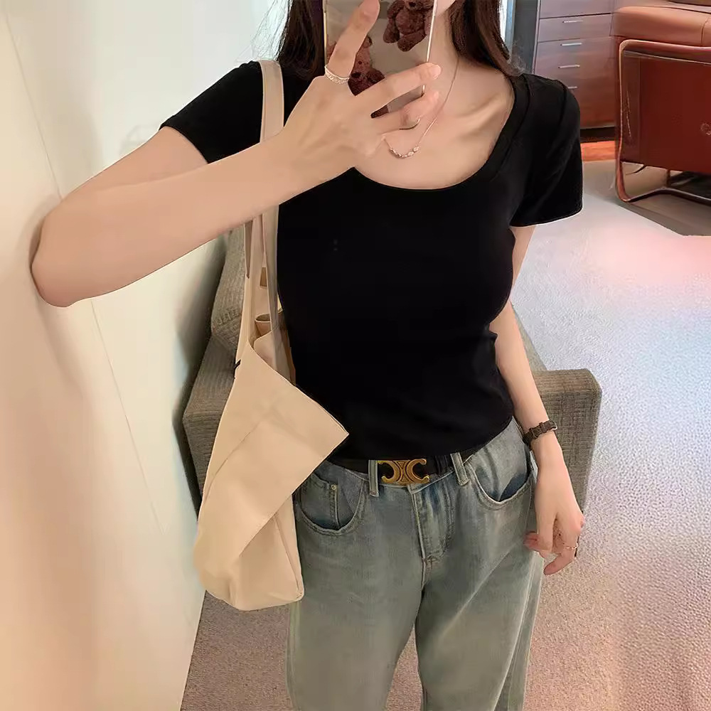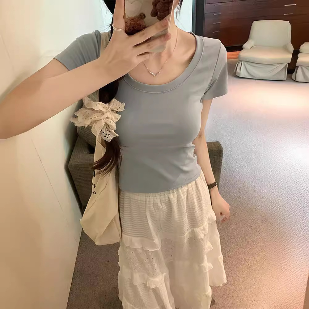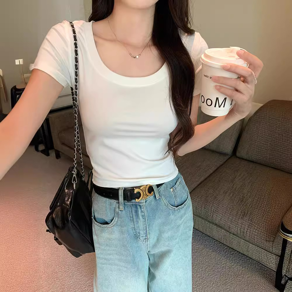 短袖U领正肩显瘦t恤衫女夏季2025新款棉大圆领宽松打底衫短款上衣