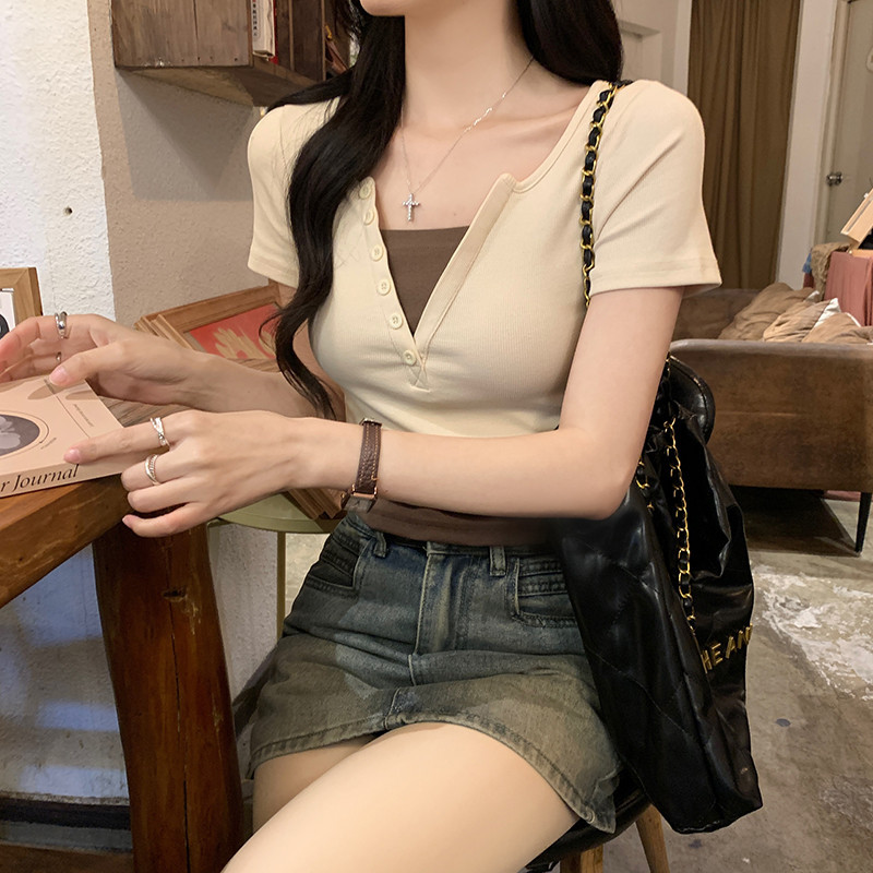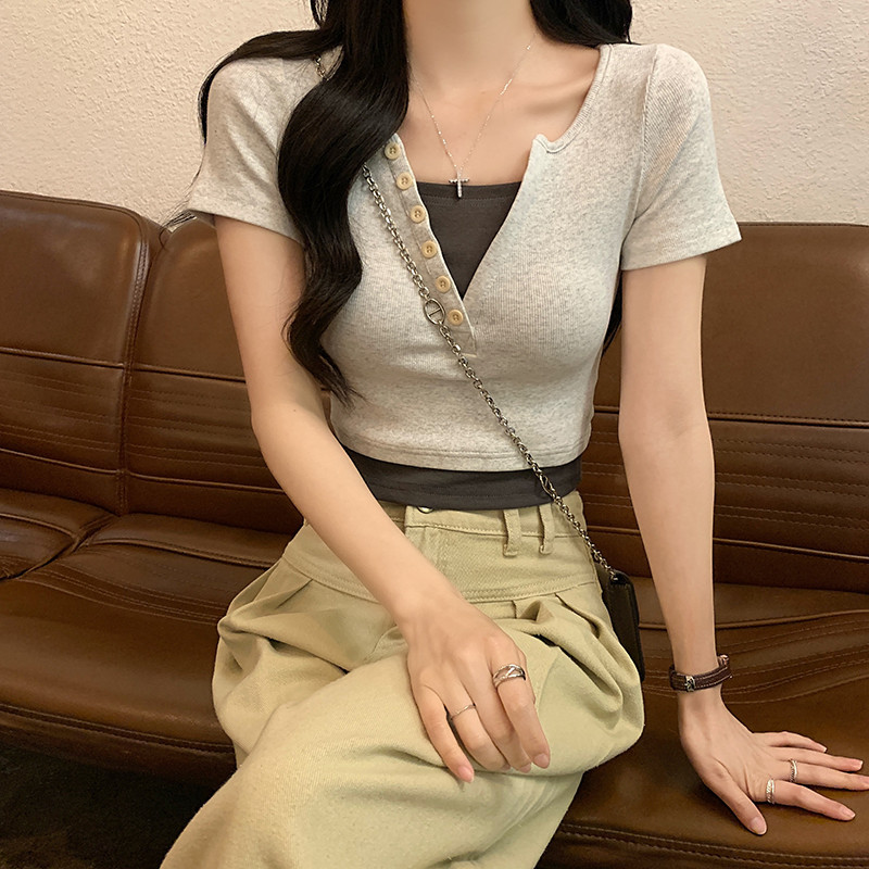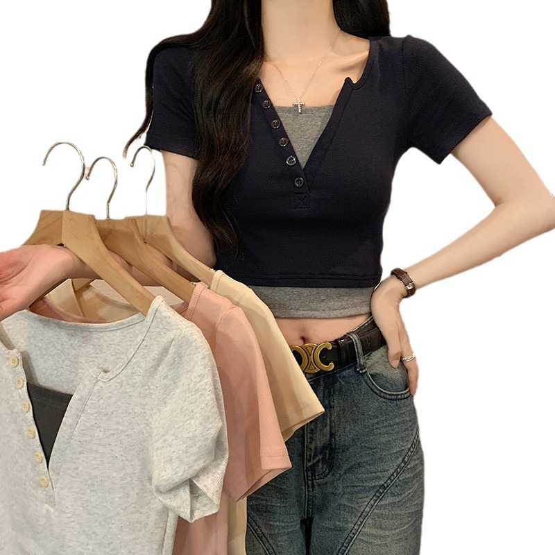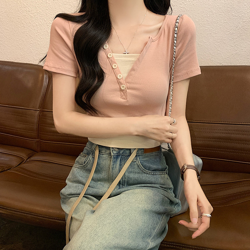 粉色正肩V领短袖T恤女夏季新款收腰显瘦假两件拼接短款甜辣小上衣