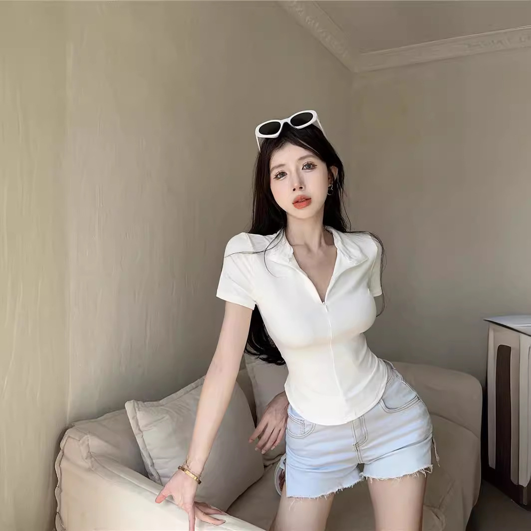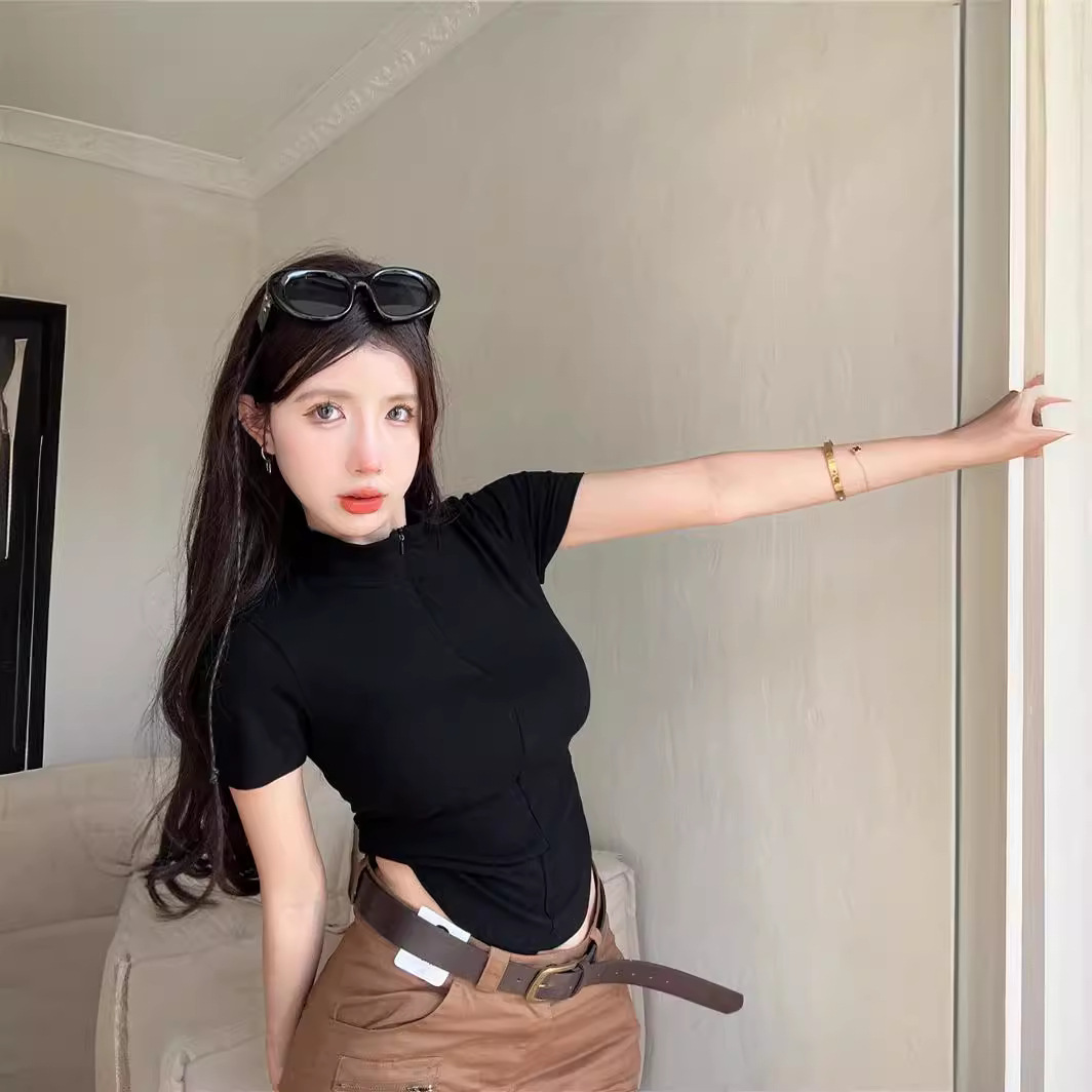 纯棉拉链翻领紧身polo领短款短袖t恤女2025新款纯欲甜辣风上衣夏