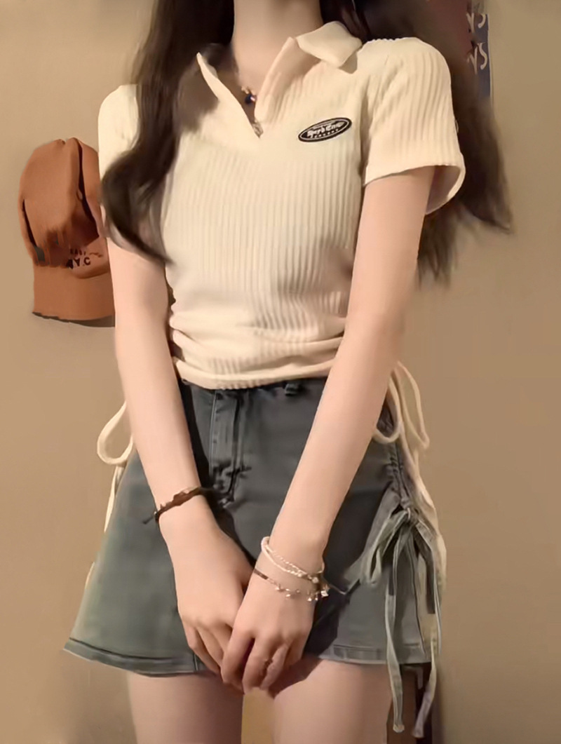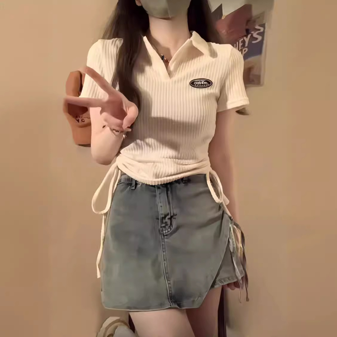 甜辣风百褶条侧边收缩绳夏短款短袖polo衫T恤女2025新款爆款上衣