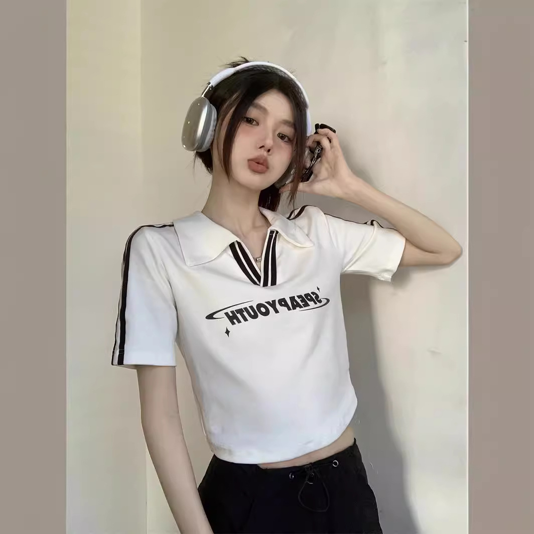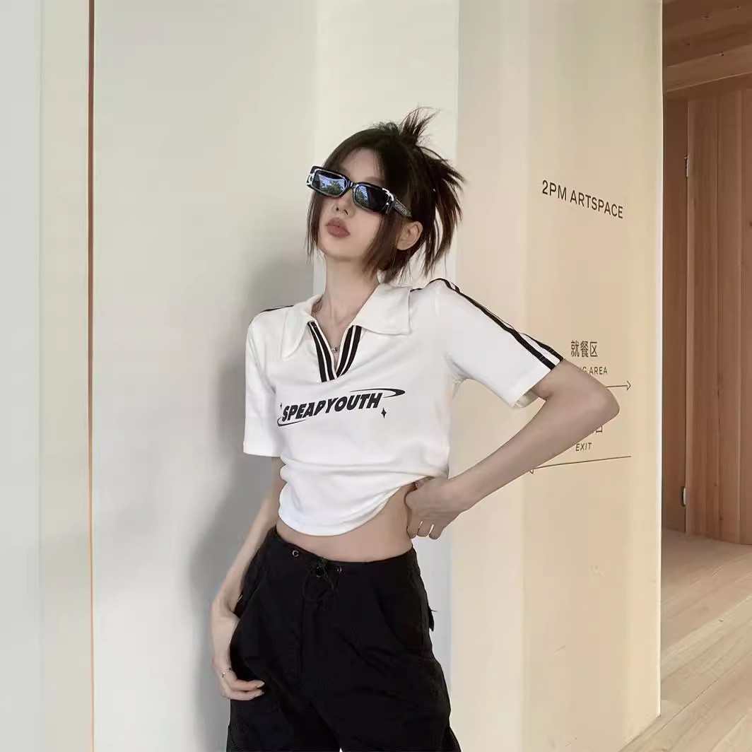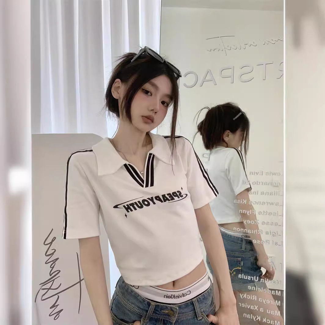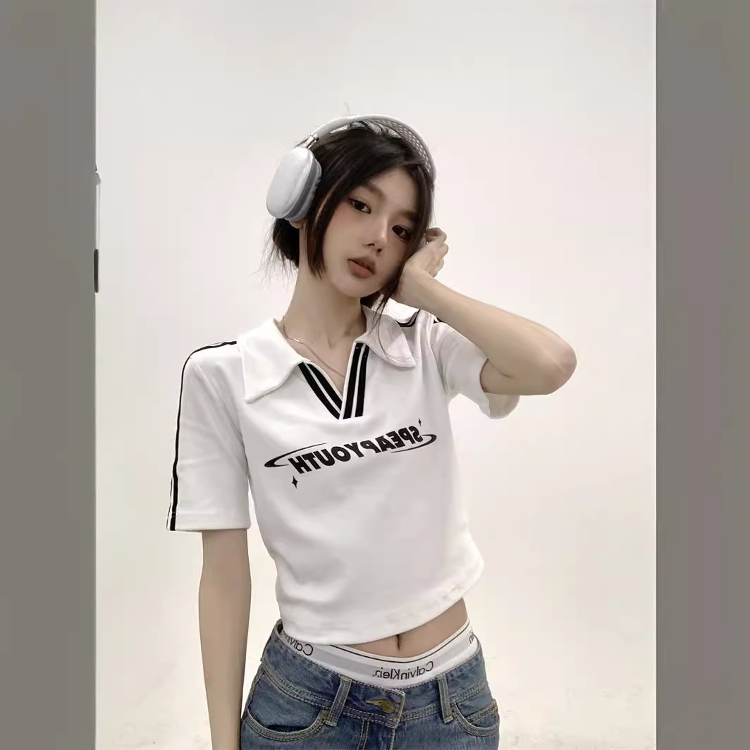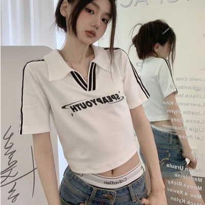 纯棉短款短袖t恤女2025新款爆款欧货辣妹上衣小众撞色拼接Polo领